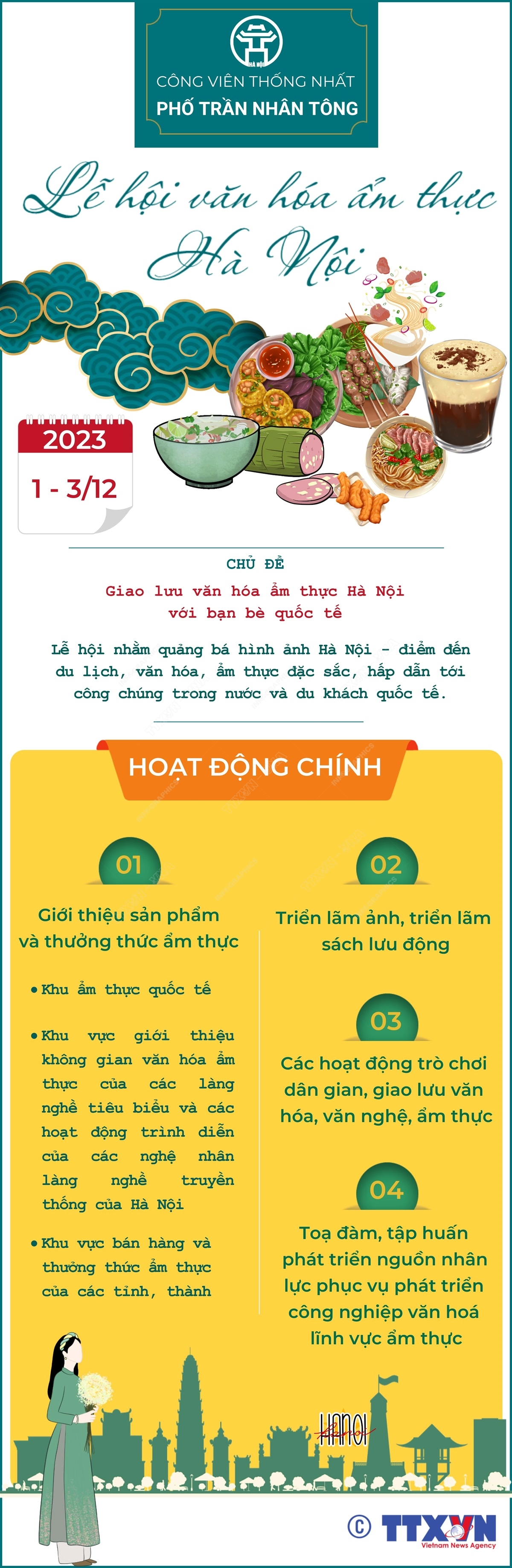 Lễ hội Văn hóa Ẩm thực Hà Nội năm 2023 sẽ diễn ra từ ngày 1 - 3/12 tại Công viên Thống Nhất, phố Trần Nhân Tông, quận Hai Bà Trưng, Hà Nội. Với chủ đề "Giao lưu văn hóa ẩm thực Hà Nội với bạn bè quốc tế," Lễ hội Văn hóa Ẩm thực Hà Nội năm 2023 được tổ chức nhằm tôn vinh, bảo tồn, phát huy giá trị văn hóa, ẩm thực truyền thống của Thủ đô, đồng thời giới thiệu, quảng bá hình ảnh Hà Nội - điểm đến du lịch, văn hóa, ẩm thực đặc sắc, hấp dẫn tới công chúng trong nước và du khách quốc tế.