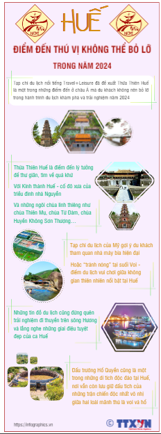 Các chuyên gia từ tạp chí chuyên về du lịch của Mỹ Travel+Leisure nhận định, Thừa Thiên Huế là một trong điểm đến thú vị không thể bỏ lỡ trong năm 2024. Theo Travel+Leisure, Huế là điểm đến lý tưởng, giúp du khách quốc tế thư giãn và tìm về quá khứ khi khám phá Việt Nam.