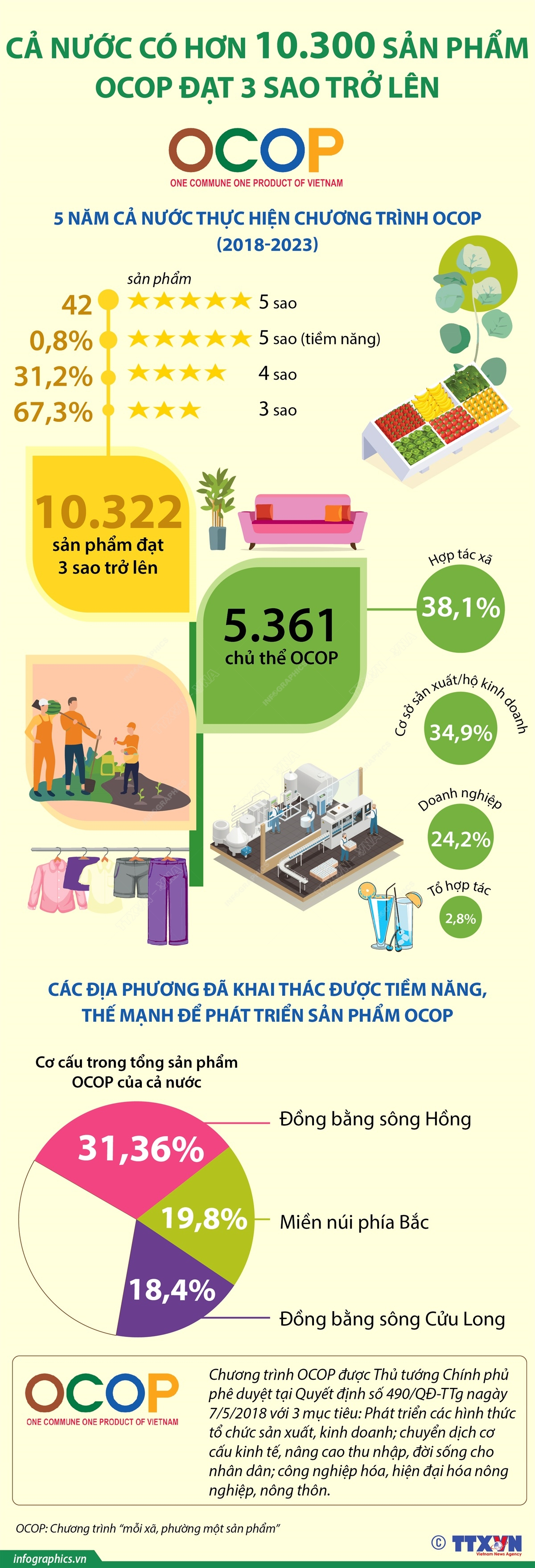 Qua hơn 5 năm (2018-2023) thực hiện Chương trình “Mỗi xã, phường một sản phẩm” (OCOP), đến nay cả nước đã có 63/63 tỉnh, thành phố đánh giá, phân hạng sản phẩm OCOP. Đã có 10.322 sản phẩm OCOP đạt 3 sao trở lên; trong đó, có 67,3% sản phẩm 3 sao, 31,2% sản phẩm 4 sao, 0,8% sản phẩm tiềm năng 5 sao và 42 sản phẩm 5 sao. Đặc biệt, đã có 5.361 chủ thể OCOP; trong đó, có 38,1% là hợp tác xã, 24,2% là doanh nghiệp, 34,9% là cơ sở sản xuất/hộ kinh doanh, còn lại là tổ hợp tác.