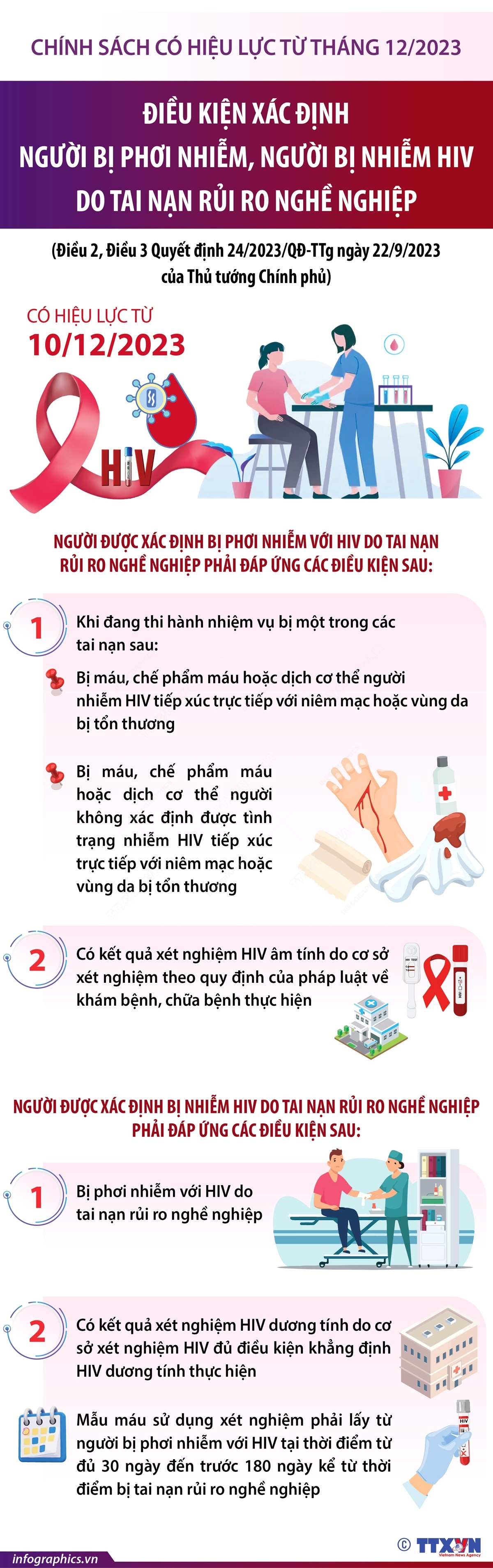 Theo Quyết định 24/2023/QĐ-TTg ngày 22/9/2023 của Thủ tướng Chính phủ về điều kiện xác định người bị phơi nhiễm với HIV, người bị nhiễm HIV do tai nạn rủi ro nghề nghiệp, từ 10/12/2023, người được xác định bị nhiễm HIV do tai nạn rủi ro nghề nghiệp phải đáp ứng các điều kiện: Bị phơi nhiễm với HIV do tai nạn rủi ro nghề nghiệp Có kết quả xét nghiệm HIV dương tính do cơ sở xét nghiệm HIV đủ điều kiện khẳng định HIV dương tính thực hiện. Mẫu máu sử dụng xét nghiệm phải lấy từ người bị phơi nhiễm với HIV tại thời điểm từ đủ 30 ngày đến trước 180 ngày kể từ thời điểm bị tai nạn rủi ro nghề nghiệp.