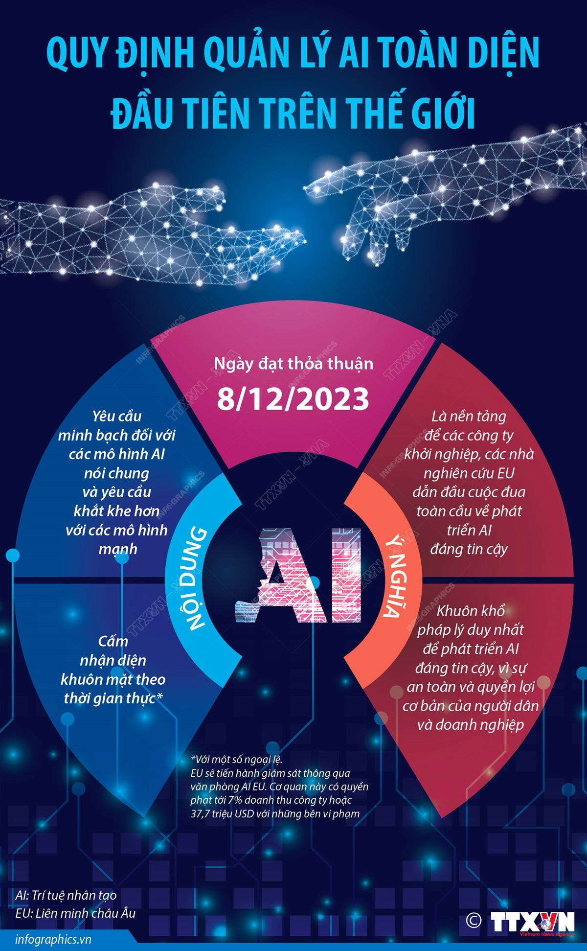 Các nước thành viên và các nghị sĩ Liên minh châu Âu (EU) mới đây đã đạt được thỏa thuận về quy định toàn diện đầu tiên nhằm quản lý trí tuệ nhân tạo (AI). Với việc đạt được thỏa thuận chính trị về Đạo luật AI, EU đã trở thành lục địa đầu tiên lập ra quy định rõ ràng về việc sử dụng công nghệ này. Đạo luật là nền tảng để các công ty khởi nghiệp và các nhà nghiên cứu EU dẫn đầu cuộc đua toàn cầu về phát triển AI đáng tin cậy.