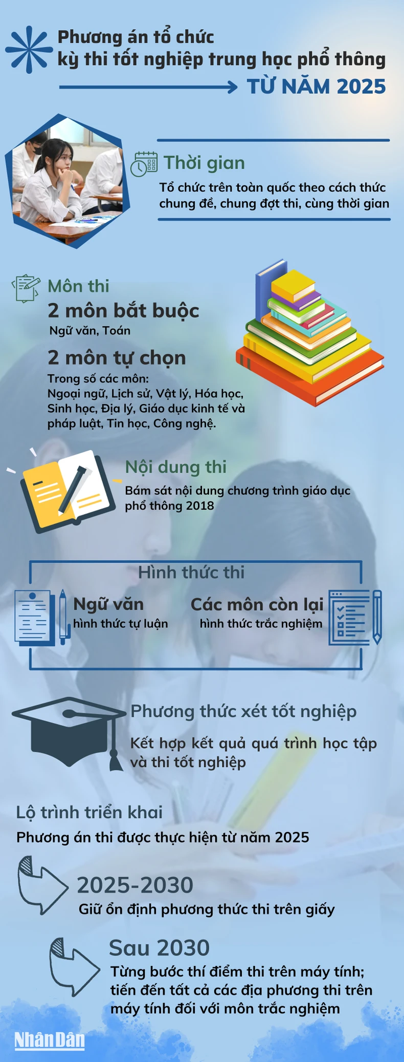 Từ năm 2025, thí sinh tham dự kỳ thi tốt nghiệp trung học phổ thông sẽ thực hiện 4 bài thi, trong đó có 2 bài thi bắt buộc là Ngữ văn và Toán. Nội dung thi bám sát theo chương trình giáo dục phổ thông 2018.