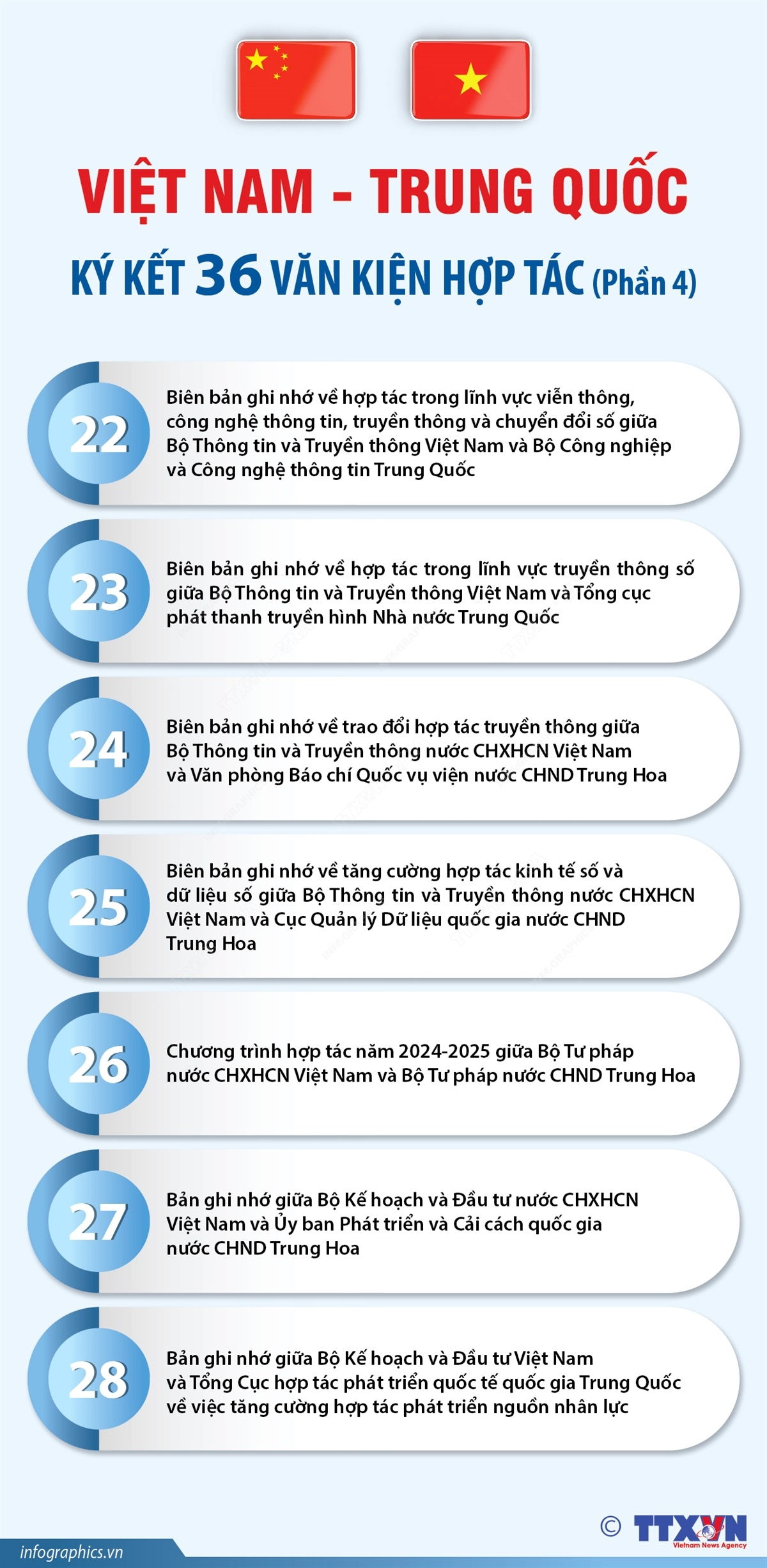 Tại Trụ sở Trung ương Đảng, ngay sau khi kết thúc hội đàm, Tổng Bí thư Ban Chấp hành Trung ương Đảng Cộng sản Việt Nam Nguyễn Phú Trọng và Tổng Bí thư Đảng Cộng sản Trung Quốc, Chủ tịch nước Cộng hòa Nhân dân Trung Hoa Tập Cận Bình nghe báo cáo về 36 văn bản thỏa thuận hợp tác đã được các ban, bộ, ngành Trung ương và địa phương ký kết trong chuyến thăm cấp Nhà nước tới Việt Nam lần này của Tổng Bí thư, Chủ tịch nước Trung Quốc Tập Cận Bình.