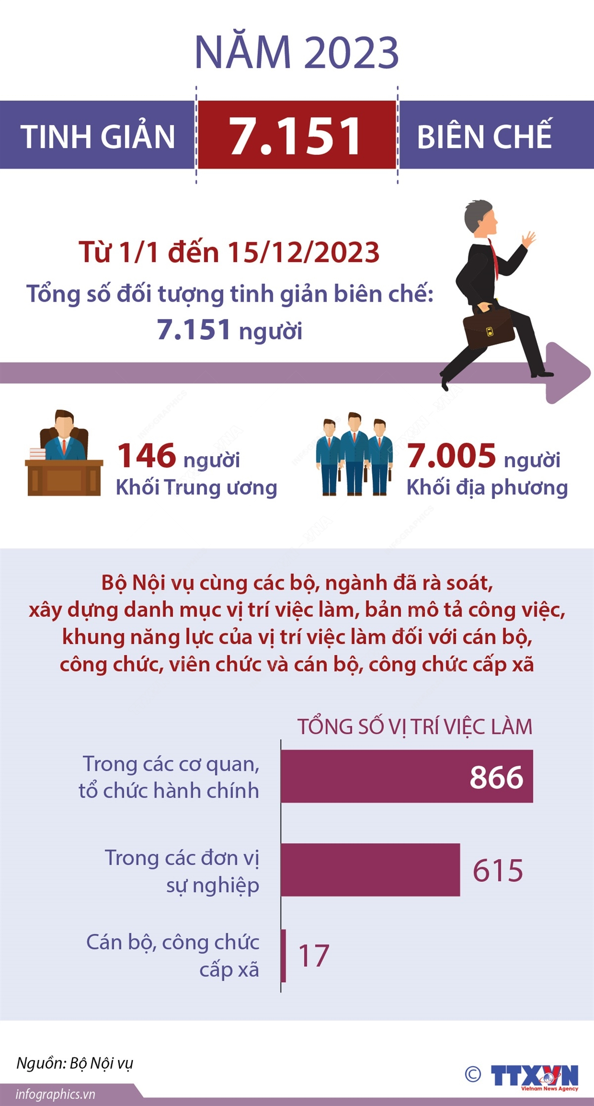 Năm 2023, các bộ, ngành, địa phương đã chủ động xây dựng kế hoạch thực hiện lộ trình tinh giản biên chế gắn với cơ cấu lại, nâng cao chất lượng đội ngũ cán bộ, công chức, viên chức theo vị trí việc làm đồng thời xác định đối tượng và thực hiện chính sách tinh giản biên chế linh hoạt, hợp lý hơn theo quy định tại Nghị định số 29/2023/NĐ-CP về tinh giản biên chế. Từ ngày 1/1/2023 đến 15/12/2023, tổng số đối tượng tinh giản biên chế là 7.151 người, trong đó khối Trung ương tinh giản 146 người khối địa phương tinh giản 7.005 người.