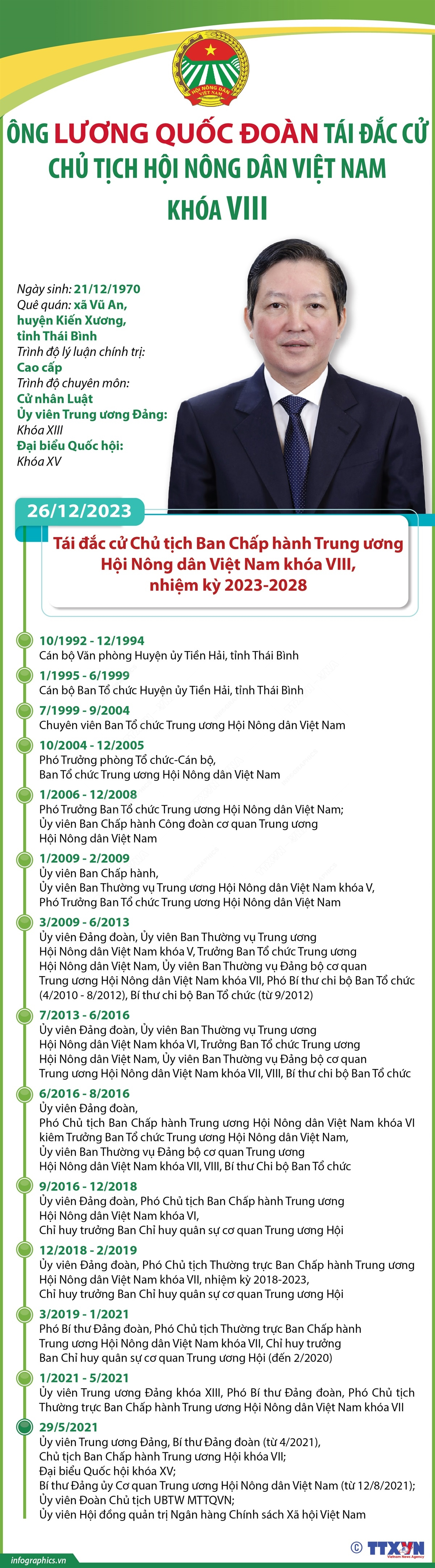Sáng 27/12/2023, tại Hà Nội, Đại hội đại biểu toàn quốc Hội Nông dân Việt Nam khóa VIII, nhiệm kỳ 2023-2028 đã thông báo kết quả Hội nghị lần thứ nhất Ban Chấp hành Trung ương Hội khóa VIII. Hội nghị lần thứ nhất Ban Chấp hành Trung ương Hội Nông dân Việt Nam khóa VIII họp ngày 26/12/2023 đã bầu 18 Ủy viên Ban Thường vụ, bầu Chủ tịch và 4 Phó Chủ tịch. Ông Lương Quốc Đoàn, Ủy viên Trung ương Đảng, Bí thư Đảng đoàn, Chủ tịch Hội Nông dân Việt Nam khóa VII, tái đắc cử chức danh Chủ tịch khóa VIII, nhiệm kỳ 2023-2028.