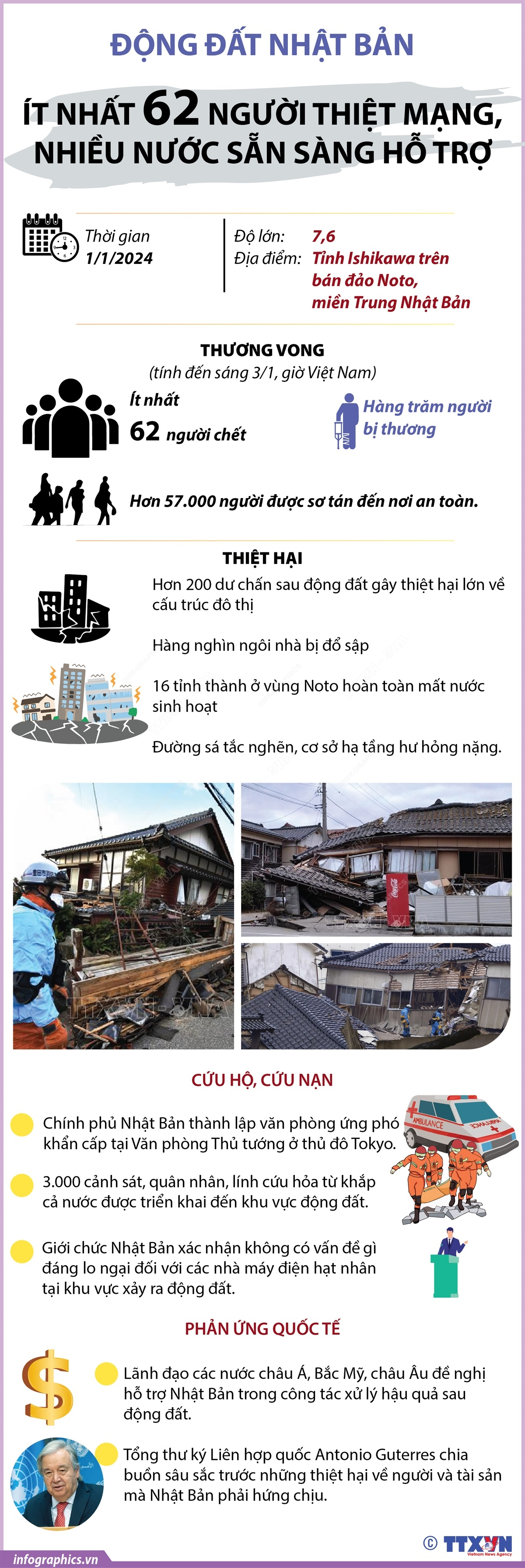 Tỉnh Ishikawa trên bán đảo Noto, miền Trung Nhật Bản ngày 1/1/2024 đã hứng chịu trận động đất ban đầu có độ lớn 7,6 - mạnh nhất kể từ năm 1885. Tính đến 9h sáng 3/1 (theo giờ VN), ít nhất 62 người đã thiệt mạng và hàng trăm người khác bị thương tại Ishikawa cũng như các tỉnh Toyama, Niigata, Fukui và Gifu. Trận động đất lớn không chỉ gây thiệt hại lớn về con người và cơ sở hạ tầng mà đang ảnh hưởng lớn đến dịch vụ bán lẻ và vận chuyển ở nhiều địa phương lân cận. Lần gần nhất trước đó Nhật Bản từng chứng kiến động đất mạnh như vậy là vào cuối năm 2018 tại Hokkaido.