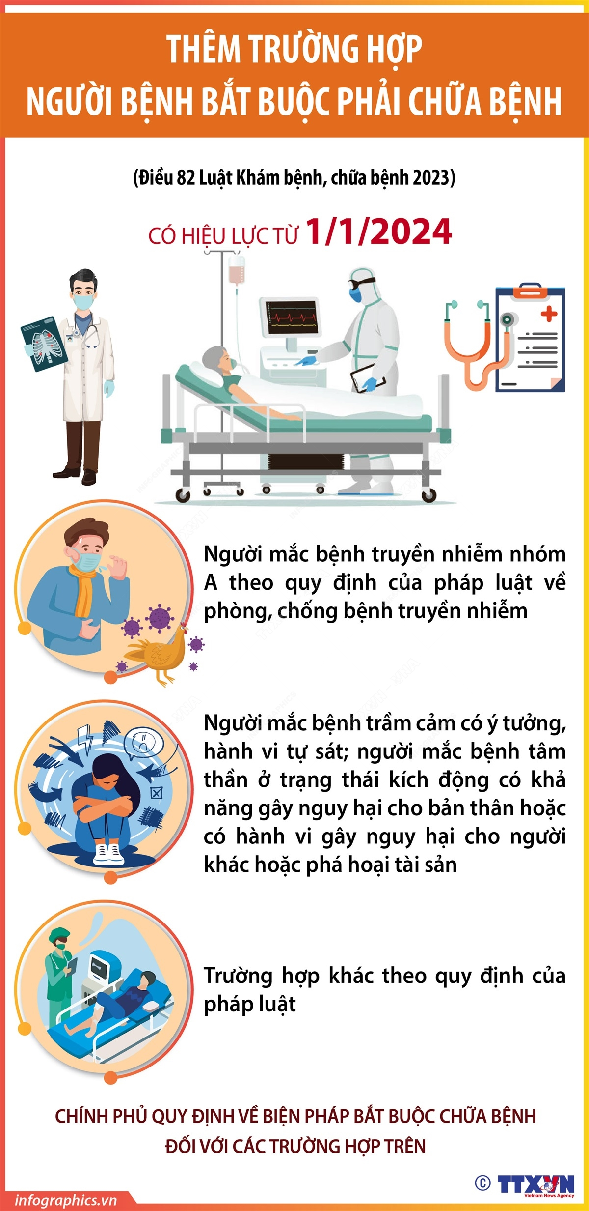 Kể từ 1/1/2024, Luật Khám bệnh, chữa bệnh 2023 có hiệu lực. Điều 82 quy định các trường hợp bắt buộc phải chữa bệnh: Người mắc bệnh truyền nhiễm nhóm A theo quy định của pháp luật về phòng, chống bệnh truyền nhiễm; Người mắc bệnh trầm cảm có ý tưởng, hành vi tự sát; người mắc bệnh tâm thần ở trạng thái kích động có khả năng gây nguy hại cho bản thân hoặc có hành vi gây nguy hại cho người khác hoặc phá hoại tài sản và Trường hợp khác theo quy định của pháp luật.