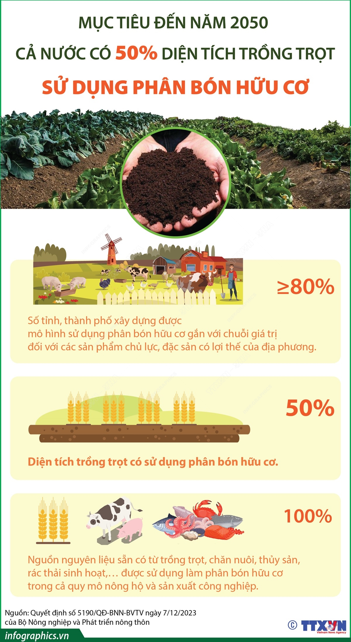 Mục tiêu đến năm 2050: Cả nước có 50% diện tích trồng trọt sử dụng phân bón hữu cơ