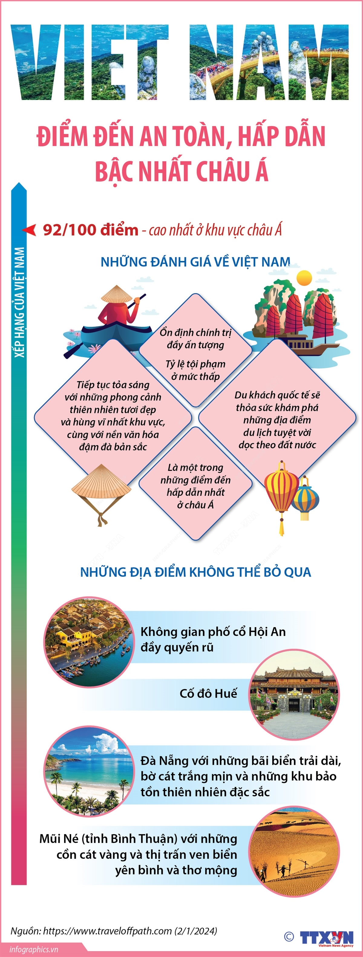 Việt Nam là nước an toàn nhất đồng thời là một trong những địa chỉ du lịch hấp dẫn nhất ở khu vực châu Á cho mùa du lịch năm 2024. Đây là đánh giá trên trang https://www.traveloffpath.com - một trong những trang thông tin về du lịch có quy mô lớn nhất khu vực Bắc Mỹ.