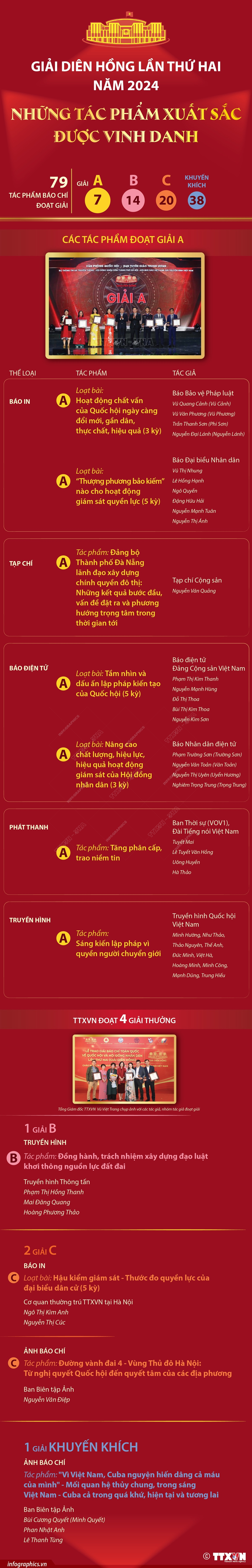 Lễ Tổng kết và trao Giải Báo chí toàn quốc về Quốc hội và Hội đồng nhân dân (Giải Diên Hồng) lần thứ hai năm 2024 đã được tổ chức tại Cung Văn hóa Lao động Hữu nghị Việt - Xô, Hà Nội. Tại buổi lễ, đại diện lãnh đạo Đảng, Nhà nước đã trao 14 giải B, 20 giải C, 38 giải Khuyến khích tặng các tác giả đoạt giải.