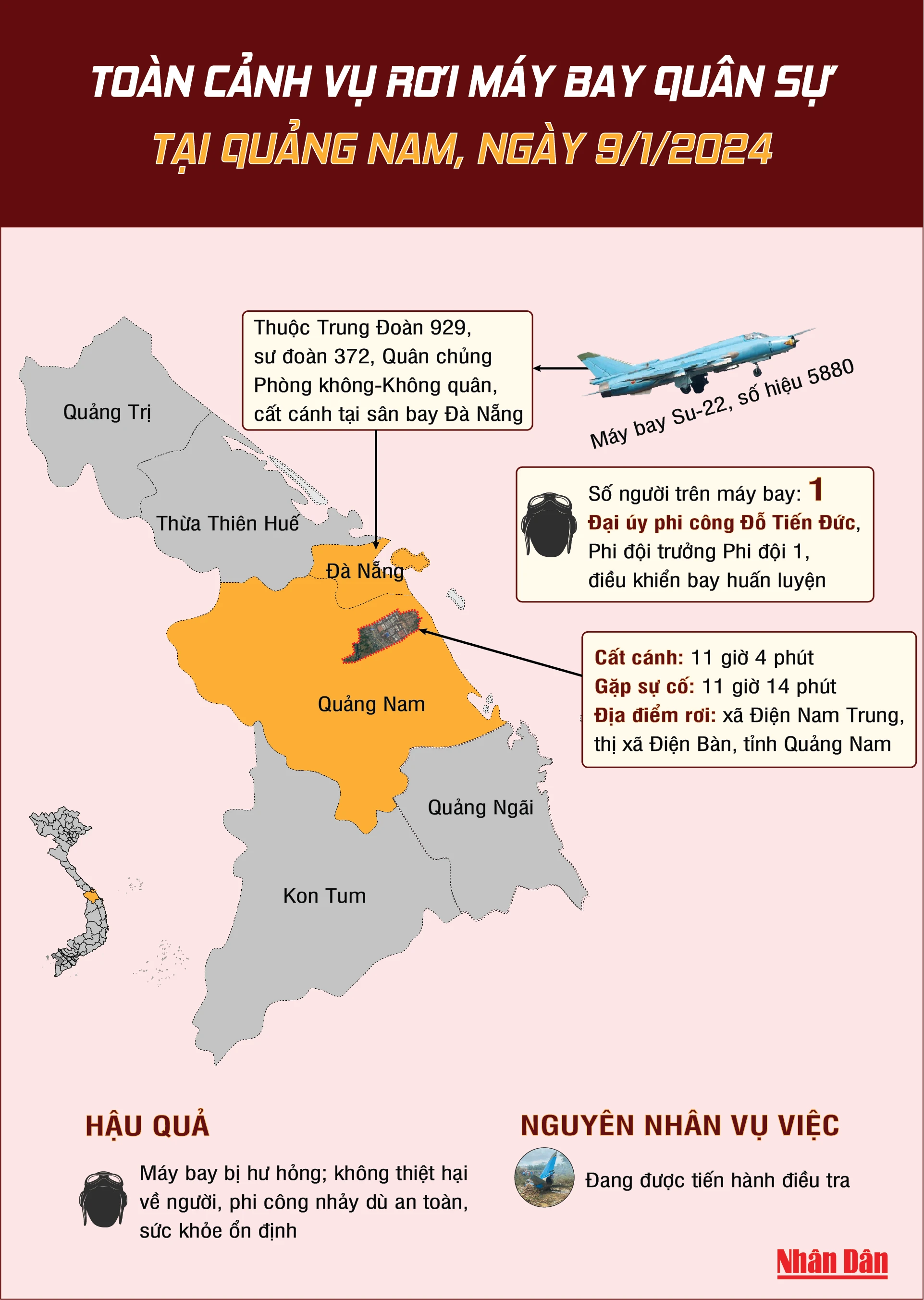 Máy bay Su 22, số hiệu 5880 do Đại úy phi công Đỗ Tiến Đức, Phi đội trưởng Phi đội 1 điều khiển; cất cánh lúc 11 giờ 4 phút, ngày 9/1, đến 11 giờ 14 phút cùng ngày phi công báo máy bay gặp sự cố không thể về hạ cánh được.