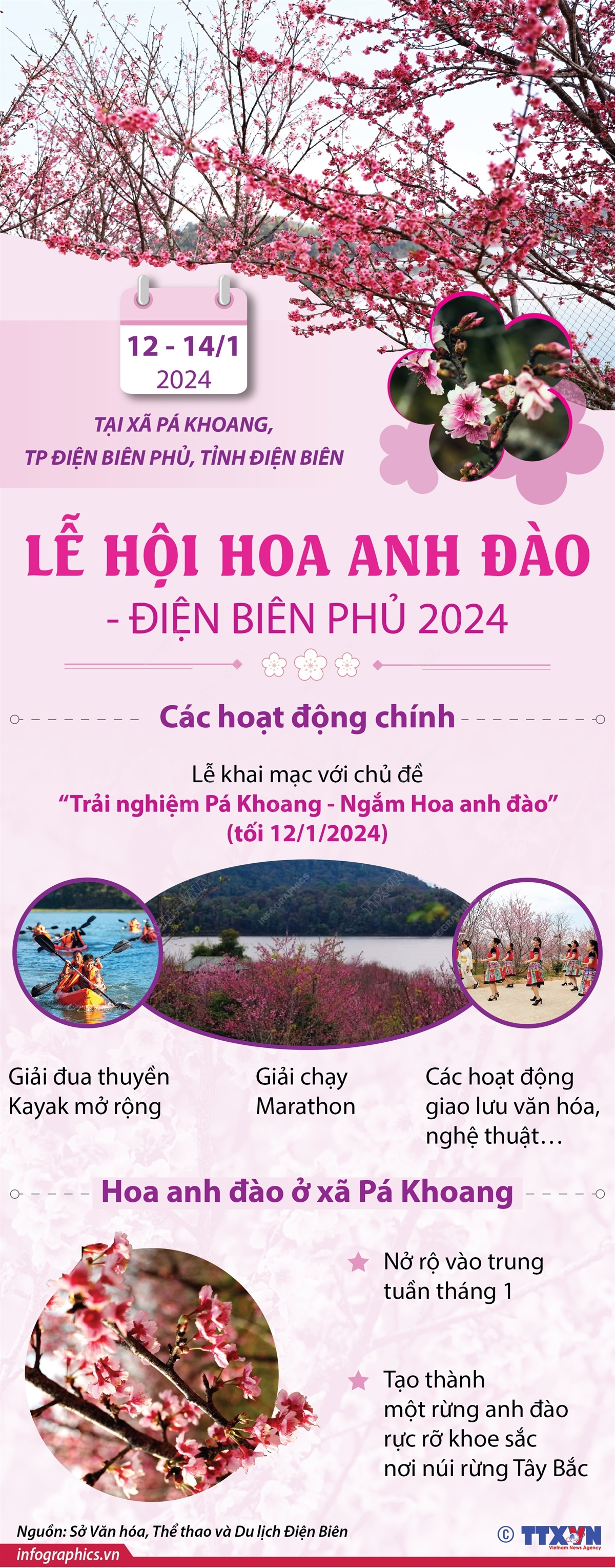 Lễ hội Hoa anh đào - Điện Biên Phủ năm 2024 được tỉnh Điện Biên tổ chức từ ngày 12 - 14/1/2024 tại xã Pá Khoang, thành phố Điện Biên Phủ, tỉnh Điện Biên. Đây là năm đầu tiên sự kiện Hoa Anh Đào - Pá Khoang được nâng tầm lên thành Lễ hội Hoa anh đào - Điện Biên Phủ. Lễ hội là hoạt động mở màn cho nhiều sự kiện chính trị, văn hóa, du lịch lớn của tỉnh Điện Biên trong năm 2024. Nhiều hoạt động văn hóa, giao lưu thi đấu thể thao diễn ra trong lễ hội, hấp dẫn du khách trong và ngoài tỉnh đến tham quan.