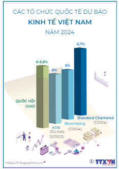 Ngân hàng Phát triển Châu Á (ADB), Bloomberg hay Ngân hàng Standard Chartered đều dự báo mức tăng trưởng GDP của Việt Nam trong năm 2024 từ 6% trở lên, đạt hoặc vượt chỉ tiêu Quốc hội giao 6-6,5%.