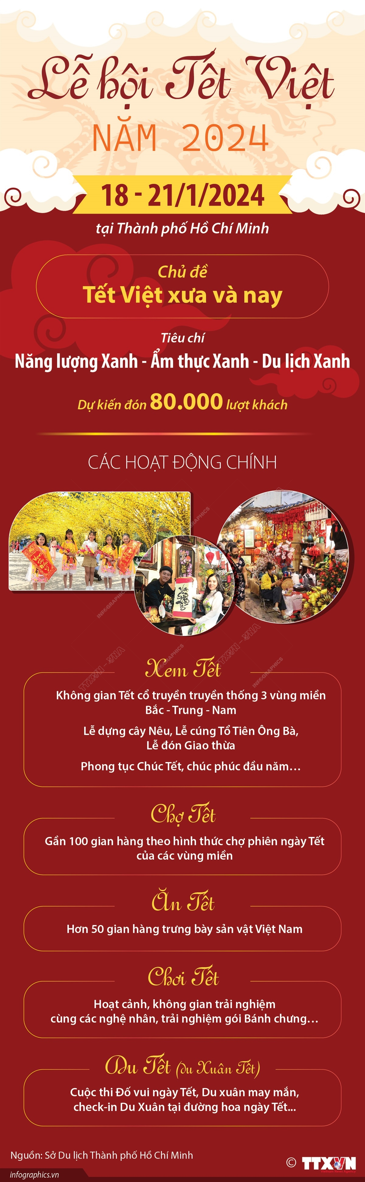 Lễ hội Tết Việt năm 2024 diễn ra từ ngày 18 - 21/1/2024 tại Thành phố Hồ Chí Minh với chủ đề “Tết Việt xưa và nay”. Lễ hội năm nay đa dạng hoạt động tái hiện mỹ tục cổ truyền ngày Tết, khơi dậy tình yêu đất nước và tôn vinh giá trị văn hóa, ẩm thực đặc trưng của Việt Nam. Lễ hội được thiết kế với nhiều không gian chính xoay quanh các hạng mục độc đáo dành cho khách tham dự. Lễ hội cũng nhằm thu hút du khách quốc tế đến với Việt Nam thông qua sự kiện lễ hội văn hóa, ẩm thực và trải nghiệm thực tế.