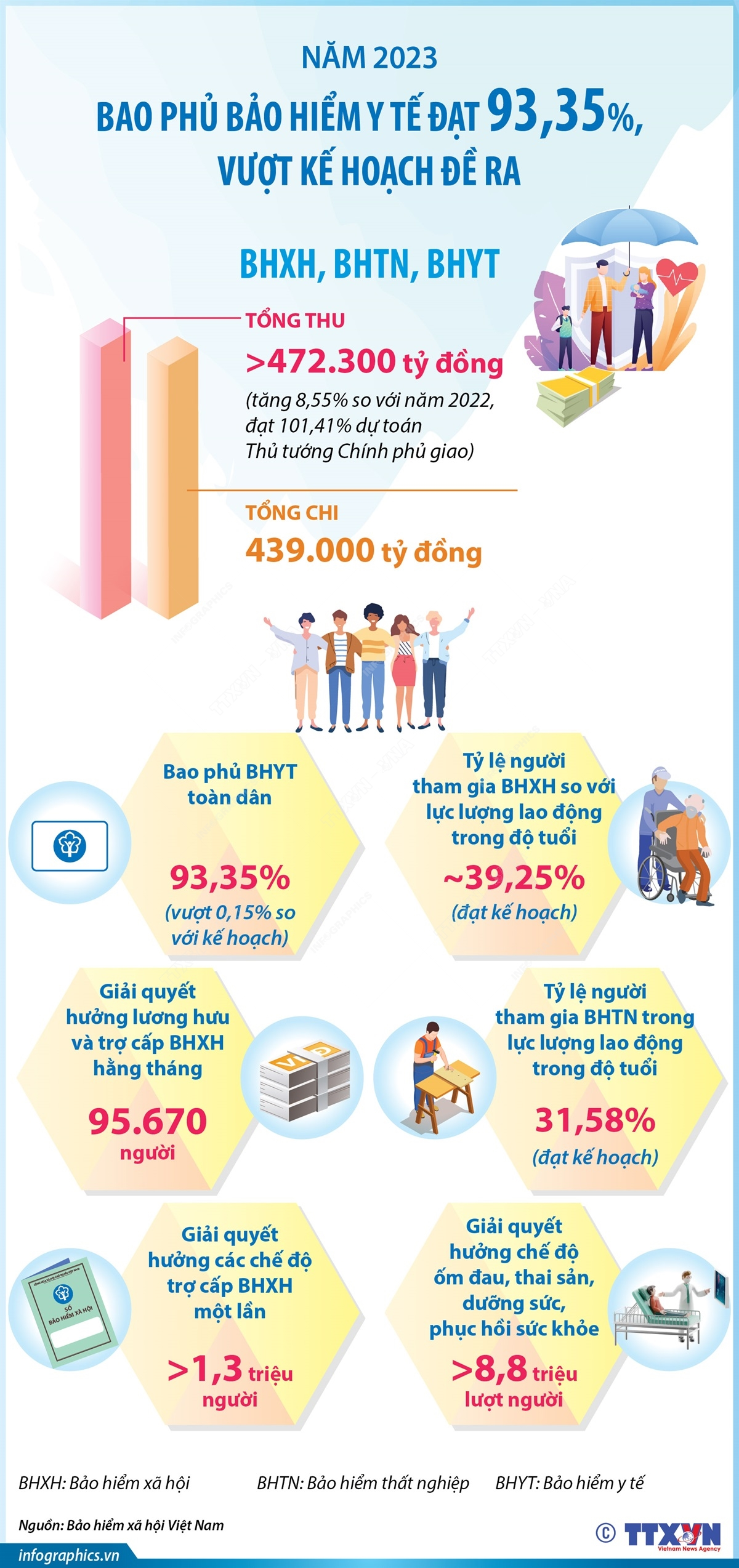 Năm 2023, ngành Bảo hiểm xã hội đã hoàn thành vượt chỉ tiêu về độ bao phủ bảo hiểm xã hội, bảo hiểm thất nghiệp, bảo hiểm y tế, đặc biệt là diện bao phủ về bảo hiểm y tế đạt 93,35% dân số, vượt 0,15% so với yêu cầu đặt ra tại Nghị quyết 01/NQ-CP ngày 6/1/2023 của Chính phủ. Đây là một chỉ tiêu kinh tế-xã hội vượt mục tiêu Nghị quyết số 68/2022/QH15 của Quốc hội về Kế hoạch phát triển kinh tế-xã hội năm 2023, tiệm cận mục tiêu bảo hiểm y tế toàn dân.