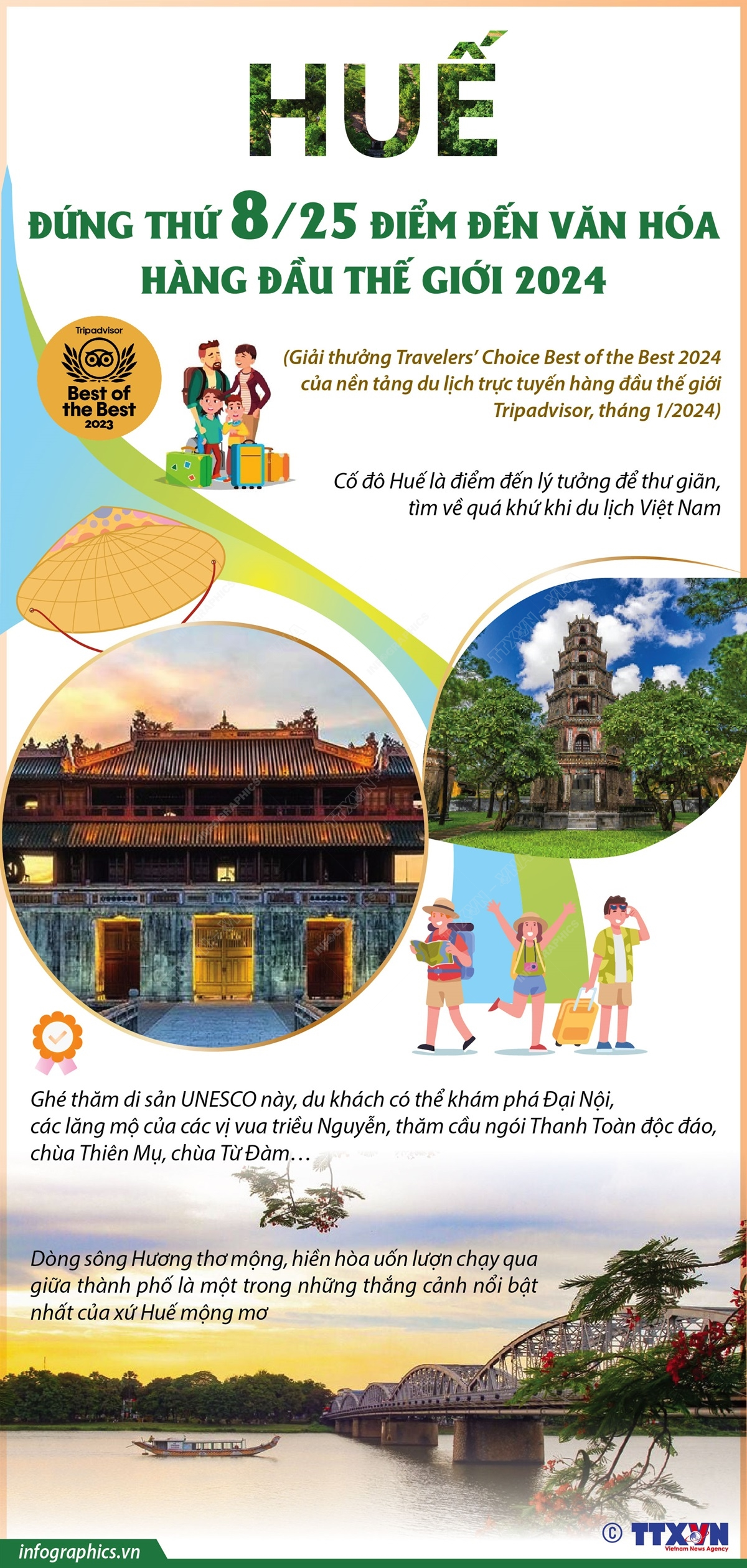 Giải thưởng Travelers’ Choice Best of the Best Destinations (Điểm đến tốt nhất trong số những điểm đến tốt nhất do du khách bình chọn) của nền tảng du lịch trực tuyến hàng đầu thế giới Tripadvisor đã vinh danh Huế ở vị trí thứ 8 trong số 25 Điểm đến văn hóa hàng đầu thế giới 2024.
