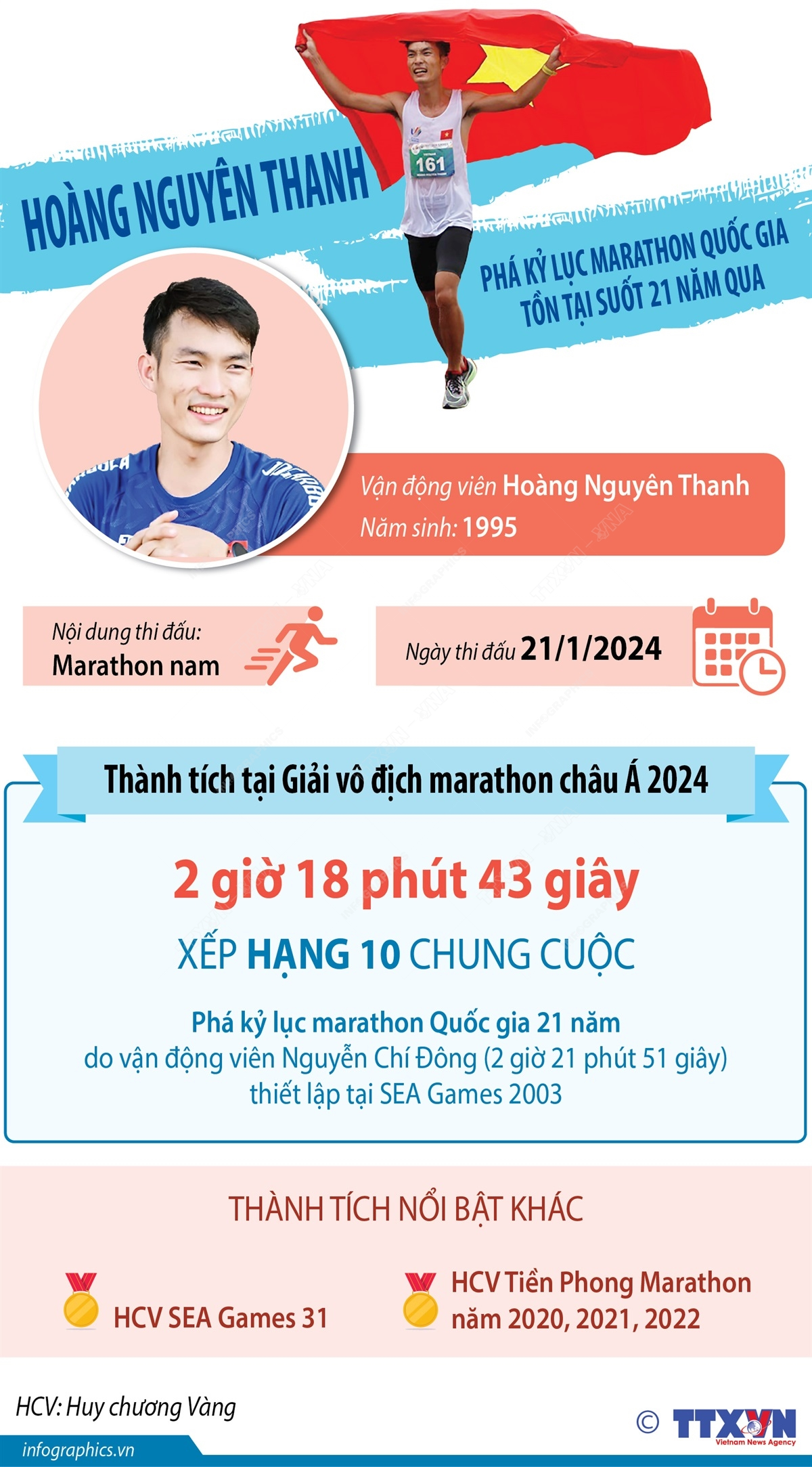 Tại Giải Marathon vô địch châu Á 2024 diễn ra tại Hong Kong (Trung Quốc), chân chạy số 1 Việt Nam Hoàng Nguyên Thanh đã về đích trong top 10, đồng thời phá kỷ lục Quốc gia ở nội dung Marathon nam tồn tại suốt 21 năm qua. Kỷ lục cũ ở nội dung này do Nguyễn Chí Đông xác lập năm 2003.