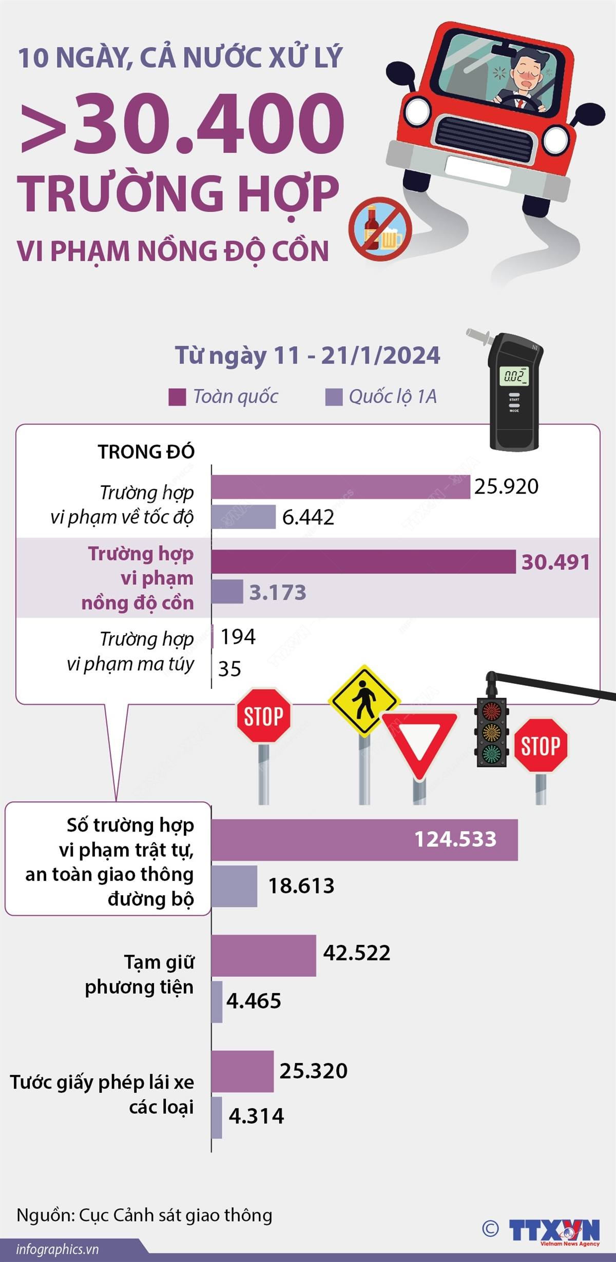 Thực hiện cao điểm bảo đảm trật tự, an toàn giao thông dịp Tết Nguyên đán Giáp Thìn 2024, từ ngày 11 - 21/1/2024, lực lượng Cảnh sát giao thông toàn quốc đã xử lý 30.491 trường hợp vi phạm nồng độ cồn. Vi phạm về tốc độ là 25.920 trường hợp; chở hàng quá tải trọng 2.028 trường hợp; quá khổ giới hạn 441 trường hợp; cải tạo phương tiện 23 trường hợp; vi phạm về ma túy 194 trường hợp…