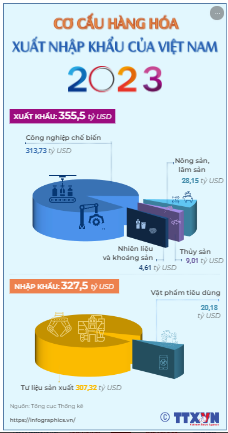 Trong năm 2023, tổng kim ngạch xuất nhập khẩu hàng hóa của Việt Nam ước đạt 683 tỷ USD, trong đó xuất khẩu 355,5 tỷ USD, nhập khẩu 327,5 tỷ USD. Về cơ cấu nhóm hàng xuất khẩu, nhóm hàng nhiên liệu và khoáng sản ước đạt 4,61 tỷ USD, chiếm 1,3%; nhóm hàng công nghiệp chế biến ước đạt 313,73 tỷ USD, chiếm 88,3%; nhóm hàng nông sản, lâm sản ước đạt 28,15 tỷ USD, chiếm 7,9%; nhóm hàng thủy sản ước đạt 9,01 tỷ USD, chiếm 2,5%. Về cơ cấu nhóm hàng nhập khẩu, nhóm hàng tư liệu sản xuất ước đạt 307,32 tỷ USD, chiếm 93,8%; nhóm hàng vật phẩm tiêu dùng ước đạt 20,18 tỷ USD, chiếm 6,2%.