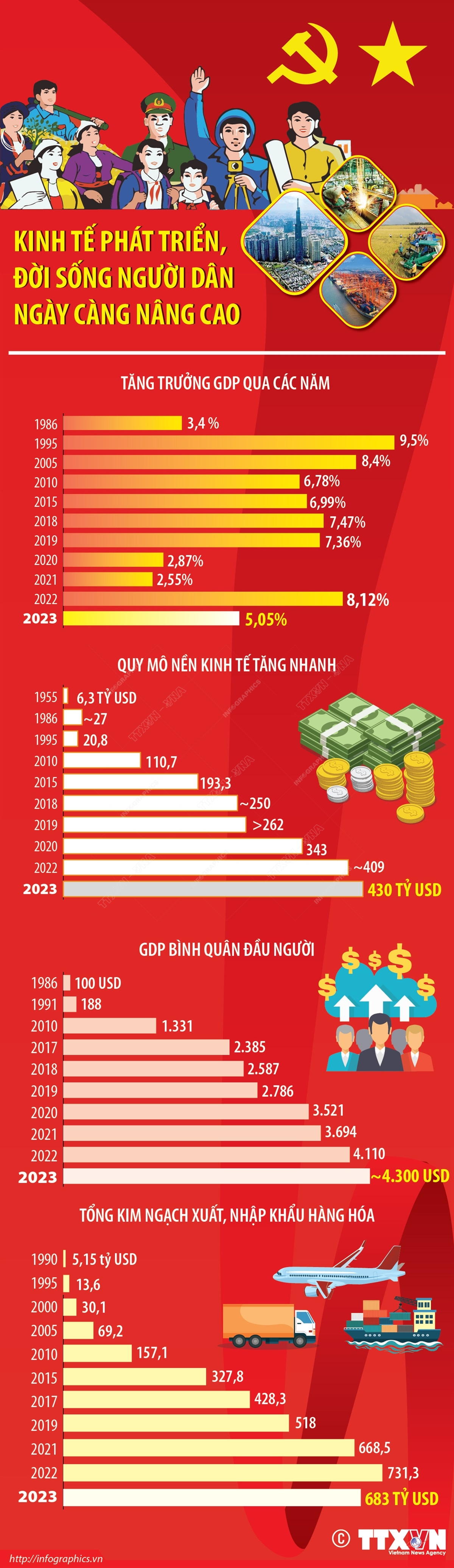 Trong suốt 94 năm qua (1930-2024), dưới sự lãnh đạo của Đảng, sự nghiệp cách mạng của nhân dân Việt Nam đã giành được những thắng lợi to lớn, có ý nghĩa lịch sử và thời đại, làm thay đổi cuộc đời mỗi con người và vận mệnh cả một dân tộc. Việt Nam đã đạt được nhiều thành tựu lớn về phát triển kinh tế-xã hội. Quy mô GDP không ngừng được mở rộng, năm 2023 đạt khoảng 430 tỷ USD, trở thành nền kinh tế lớn thứ 5 trong ASEAN và thứ 35 trong 40 nền kinh tế lớn nhất thế giới. GDP bình quân đầu người tăng 58 lần, lên mức khoảng 4.300 USD năm 2023…