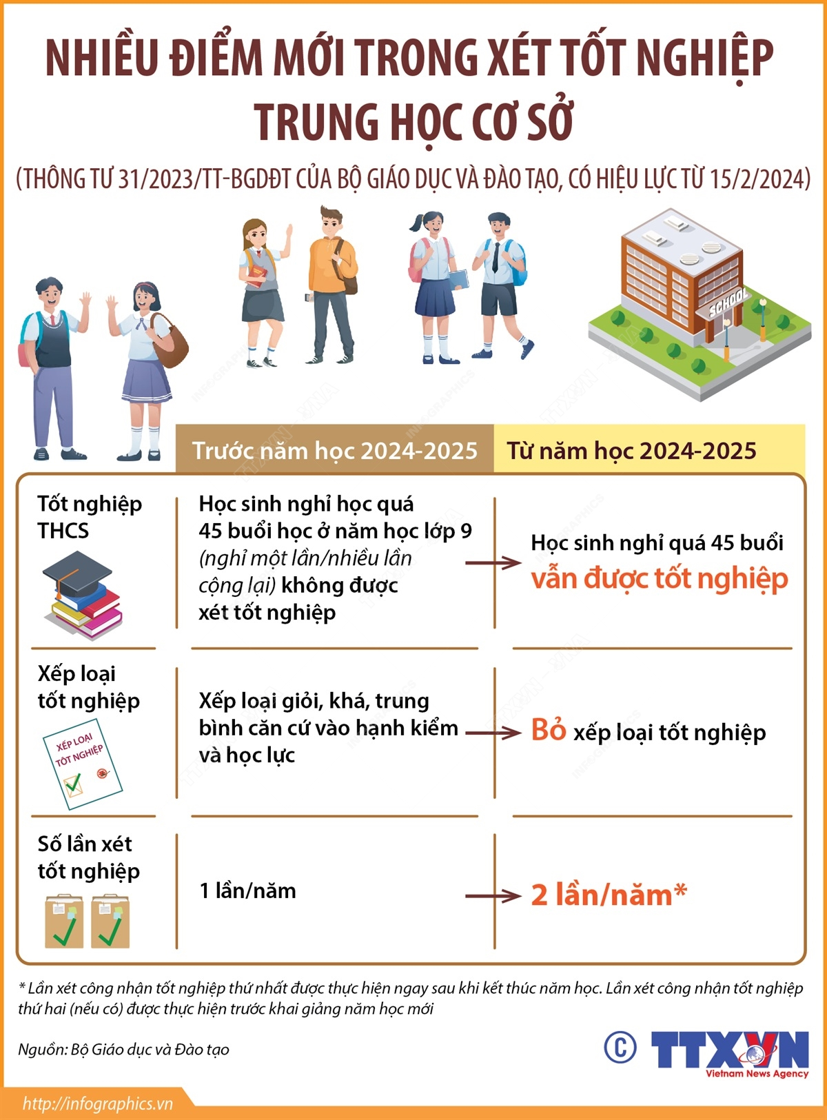 Quy chế xét công nhận tốt nghiệp trung học cơ sở mới ban hành tại Thông tư 31/2023/TT-BGDĐT chính thức có hiệu lực thi hành từ ngày 15/2/2024. Theo đó, điều kiện xét tốt nghiệp trung học cơ sở có nhiều điểm mới như: Học sinh trung học cơ sở nghỉ quá 45 buổi vẫn được tốt nghiệp, Bỏ xếp loại tốt nghiệp trung học cơ sở, tổ chức xét tốt nghiệp trung học cơ sở 2 lần/năm…