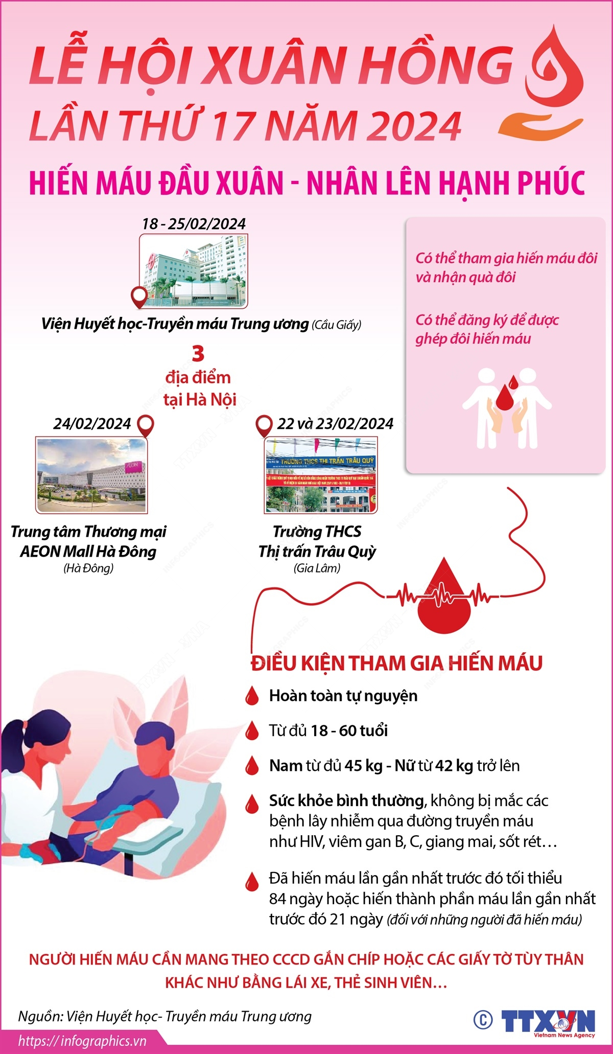 Khác với các năm trước, Lễ hội Xuân hồng lần thứ 17 năm 2024 khởi động rất sớm, từ 18/2 (tức mùng 9 Tết). Chương trình sẽ kéo dài liên tục trong 8 ngày và diễn ra tại 3 địa điểm: Viện Huyết học - Truyền máu Trung ương, Trường THCS Trâu Quỳ, Trung tâm Thương mại AEON Mall Hà Đông. Trải qua 16 kỳ tổ chức, Lễ Hội Xuân hồng đã trở thành điểm đến hấp dẫn của hàng vạn tấm lòng nhân ái mỗi dịp đầu Xuân.