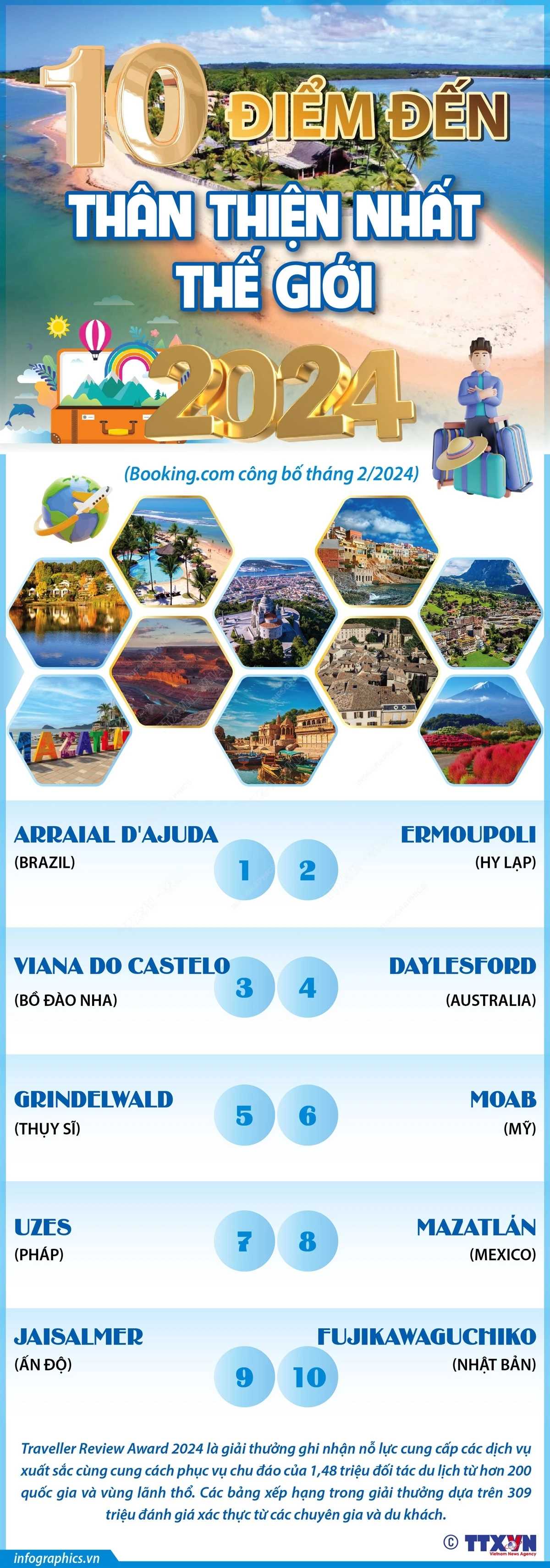 Booking.com vừa công bố bảng xếp hạng 10 điểm đến thân thiện nhất thế giới thuộc khuôn khổ giải thưởng Traveller Review Awards 2024.