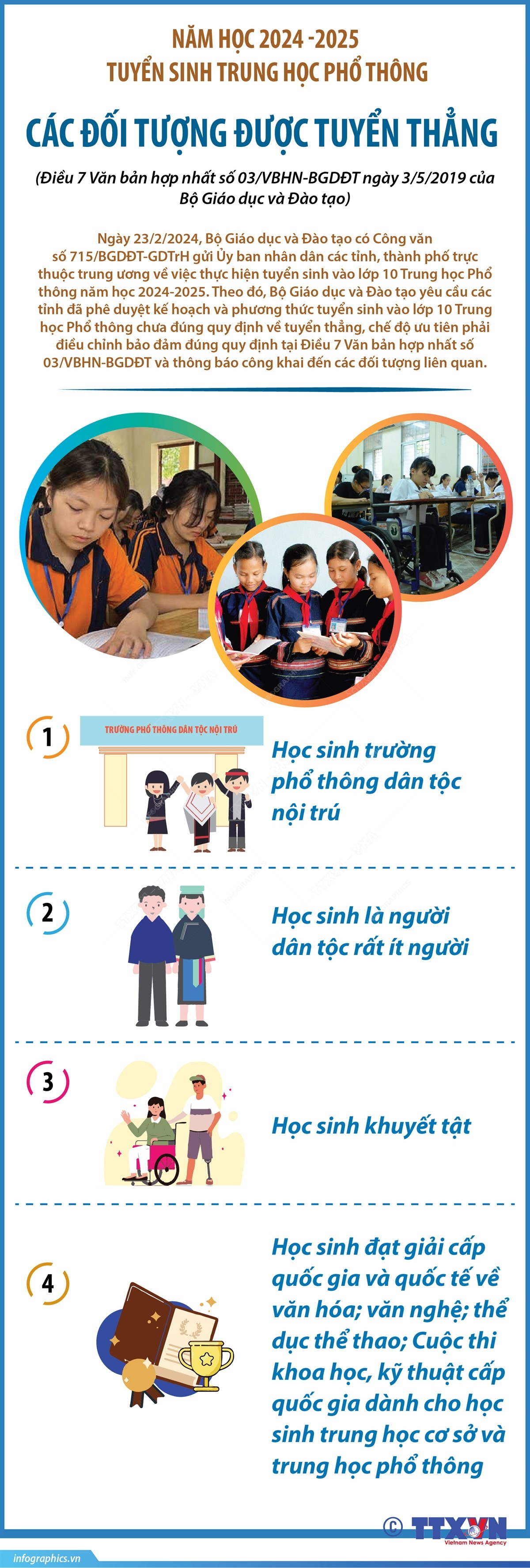 Ngày 25/2/2024, Bộ Giáo dục và Đào tạo có Công văn số 715/BGDĐT-GDTrH gửi Ủy ban nhân dân các tỉnh, thành phố trực thuộc trung ương về việc thực hiện tuyển sinh vào lớp 10 Trung học Phổ thông năm học 2024-2025. Theo đó, Bộ Giáo dục và Đào tạo yêu cầu các tỉnh đã phê duyệt kế hoạch và phương thức tuyển sinh vào lớp 10 Trung học Phổ thông chưa đúng quy định về tuyển thẳng, chế độ ưu tiên phải điều chỉnh bảo đảm đúng quy định tại Điều 7 Văn bản hợp nhất số 03/VBHN-BGDĐT và thông báo công khai đến các đối tượng liên quan.