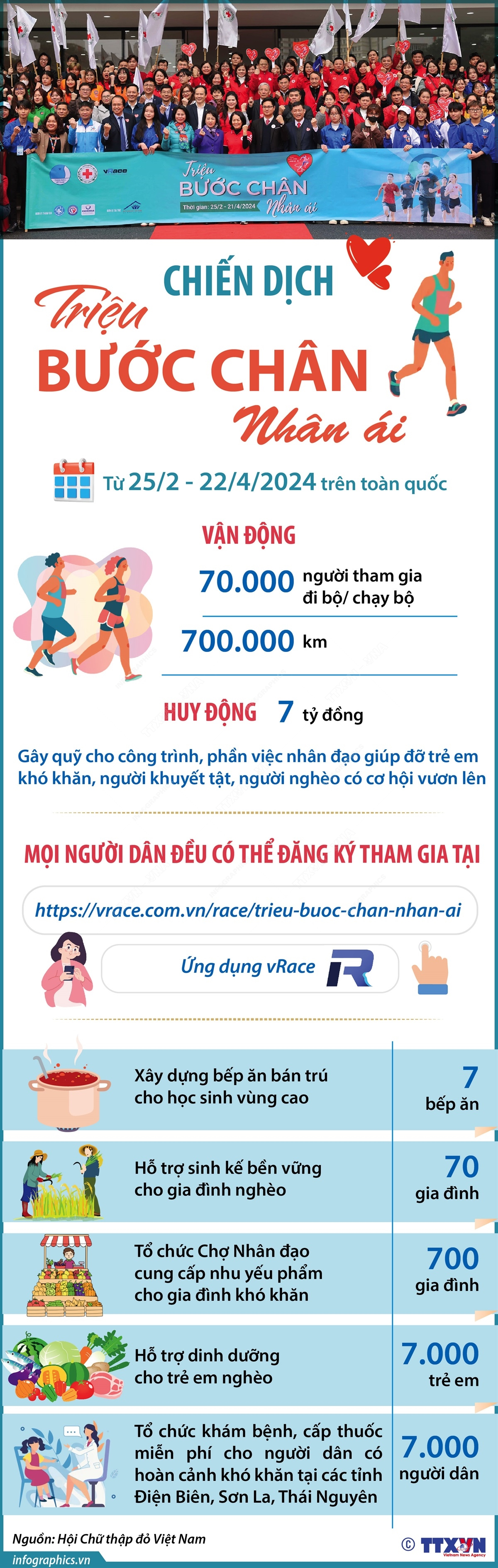 Chiến dịch "Triệu bước chân nhân ái" được phát động từ ngày 25/2 - 22/4/2024 với mục tiêu thu hút 70.000 người tham gia vận động thể thao (đi bộ/ chạy bộ), đạt 700.000km, tương ứng kinh phí vận động ủng hộ đạt 7 tỷ đồng để xây dựng bảy bếp ăn bán trú cho học sinh vùng cao; hỗ trợ sinh kế bền vững cho 70 gia đình nghèo; tổ chức Chợ Nhân đạo cung cấp nhu yếu phẩm cho 700 gia đình khó khăn… Chiến dịch nằm trong khuôn khổ chuỗi hoạt động hưởng ứng Tháng Nhân đạo quốc gia 2024.