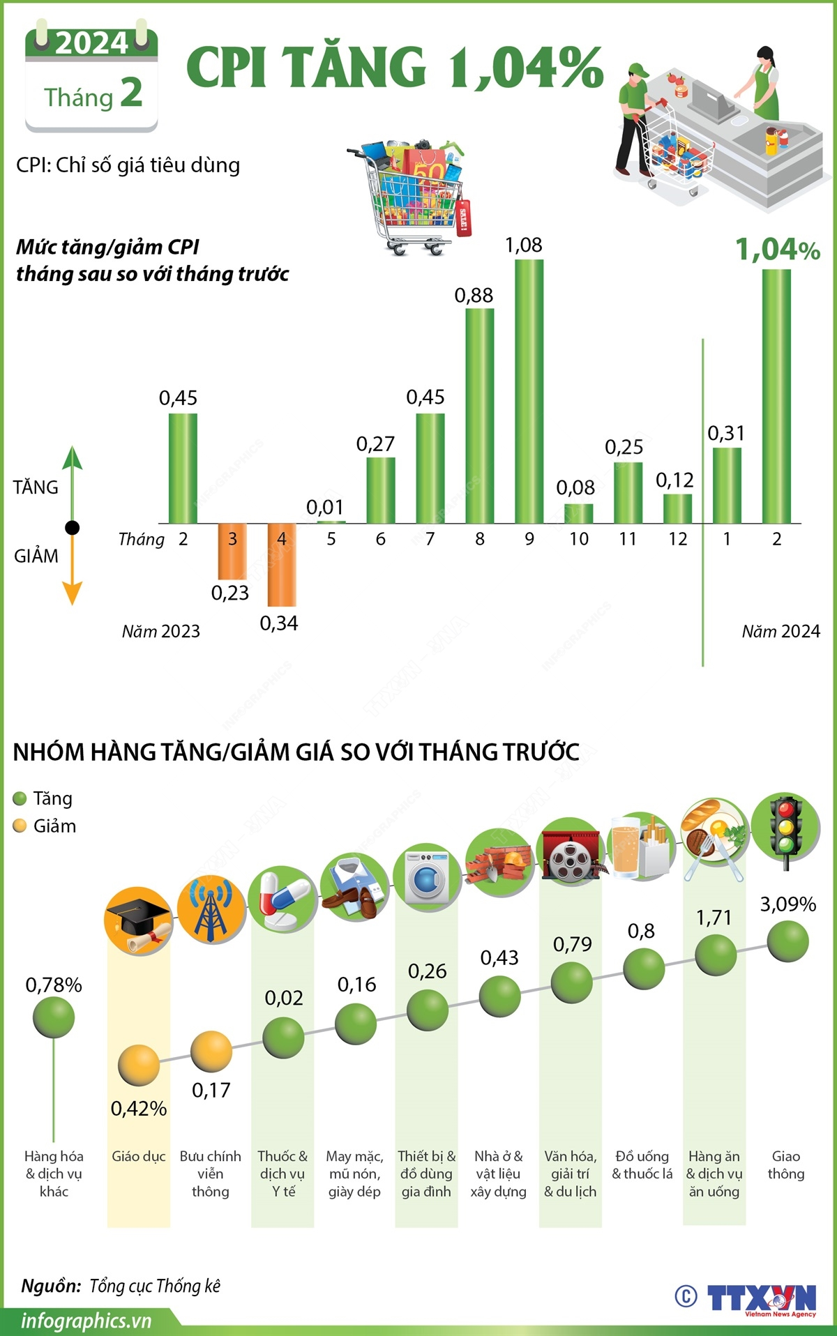 Chỉ số giá tiêu dùng (CPI) tháng 2/2024 tăng 1,04% so với tháng trước. Trong đó, có 9 nhóm hàng hóa và dịch vụ có chỉ số giá tăng và 2 nhóm hàng có chỉ số giá giảm.