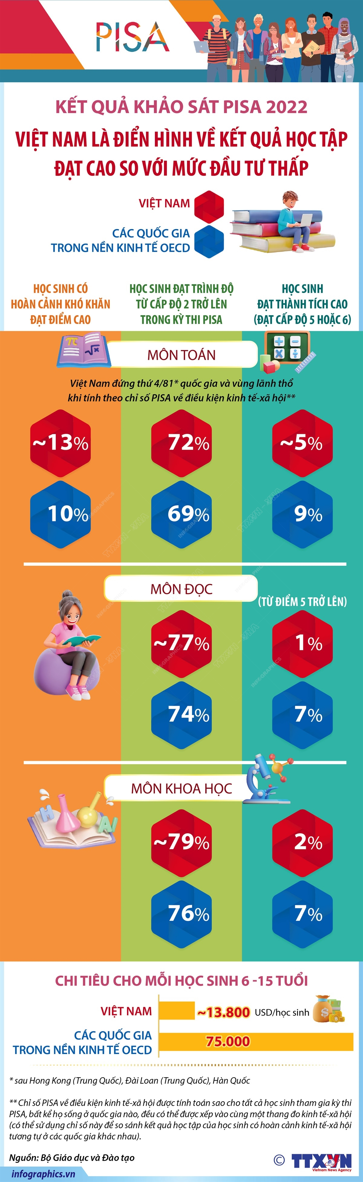 Ngày 5/12/2023, Tổ chức Hợp tác và Phát triển Kinh tế (OECD) công bố kết quả khảo sát PISA Việt Nam năm 2022. Kết quả này được OECD công bố công khai từ bài khảo sát 3 môn (Toán, Đọc, Khoa học) của 6.068 học sinh ở 178 trường, đại diện cho khoảng 939.500 học sinh 15 tuổi (ước tính khoảng 68% tổng dân số 15 tuổi) ở Việt Nam. Theo kết quả khảo sát, học sinh Việt Nam đạt điểm gần với mức trung bình của OECD ở cả 3 môn (Toán, Đọc, Khoa học), xếp thứ 34/81 quốc gia và vùng lãnh thổ, đứng thứ 2 ở khu vực ASEAN, sau Singapore.