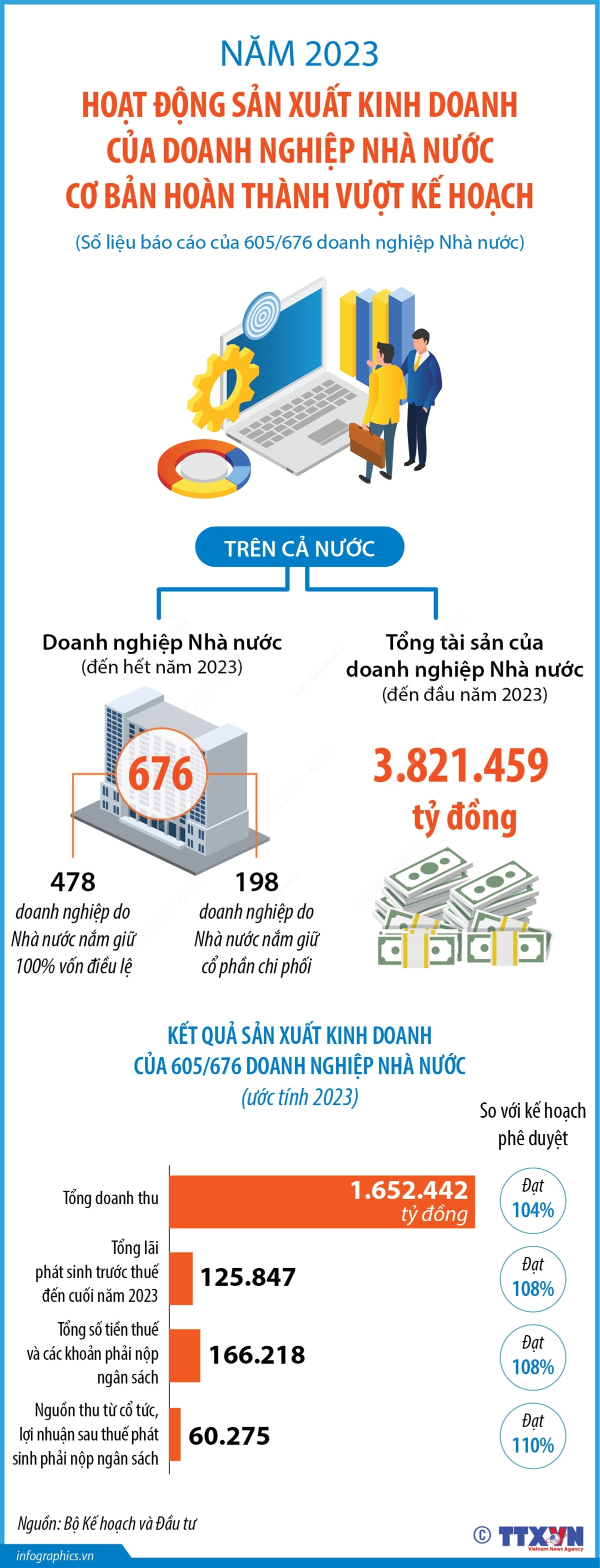 Theo Bộ Kế hoạch và Đầu tư, đến hết năm 2023, Việt Nam có 676 doanh nghiệp Nhà nước (478 doanh nghiệp do Nhà nước nắm giữ 100% vốn điều lệ và 198 doanh nghiệp do Nhà nước nắm giữ cổ phần chi phối), hiện diện ở nhiều ngành, lĩnh vực có vai trò, vị trí quan trọng của nền kinh tế.