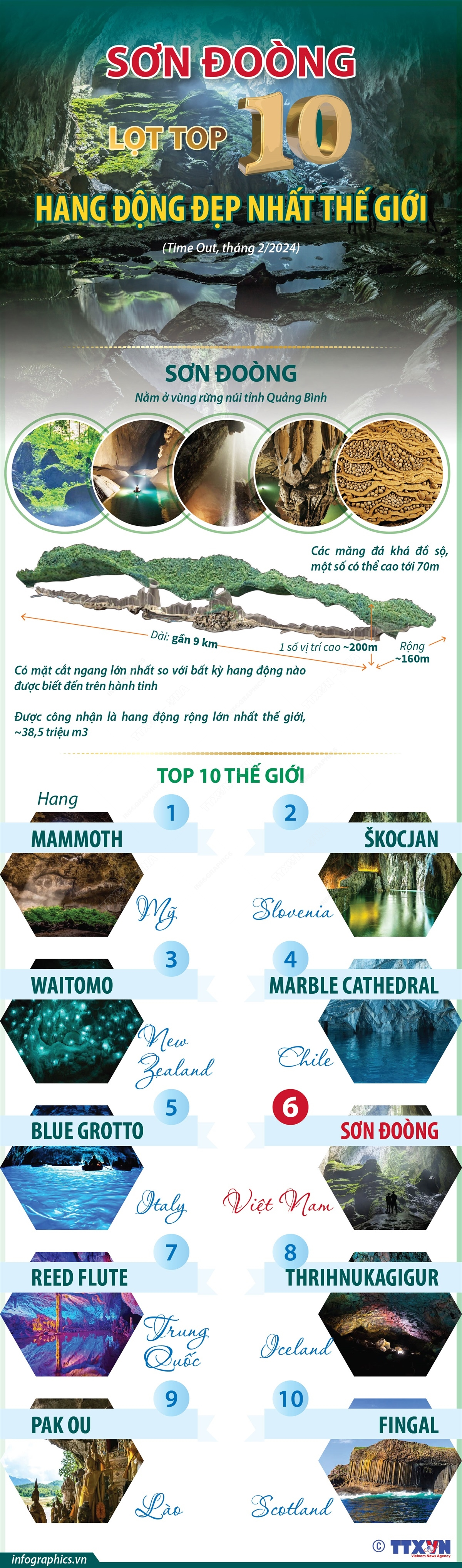 Trong số 10 hang động đẹp nhất thế giới do tạp chí chuyên về du lịch nổi tiếng Time Out của Anh bình chọn có hang Sơn Đoòng của Việt Nam. Time Out nhận định về Sơn Đoòng như sau: Nằm ở vùng rừng núi tỉnh Quảng Bình, vực thẳm khổng lồ này có mặt cắt ngang lớn nhất so với bất kỳ hang động nào được biết đến trên hành tinh, một khu vực rộng lớn đến mức khó diễn tả. Người ta cho rằng một chiếc Boeing 747 có thể bay qua mà không làm hỏng cánh.