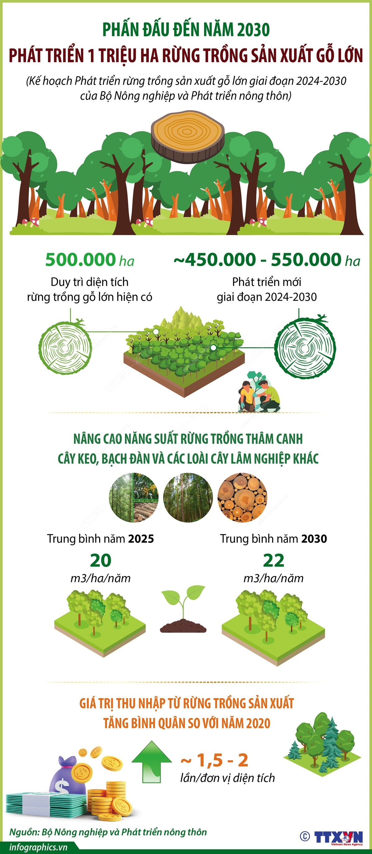 Theo Kế hoạch “Phát triển rừng trồng sản xuất gỗ lớn giai đoạn 2024 - 2030”, Bộ Nông nghiệp và Phát triển nông thôn đặt mục tiêu chung phát triển vùng rừng trồng sản xuất gỗ lớn tập trung nhằm chủ động cung cấp nguồn nguyên liệu gỗ phục vụ chế biến, tiêu dùng trong nước và xuất khẩu, nâng cao thu nhập cho người trồng rừng, góp phần bảo vệ môi trường sinh thái, thích ứng với biến đổi khí hậu và giảm nhẹ thiên tai.