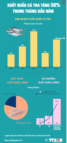 Tháng 1/2024, kim ngạch xuất khẩu cá tra Việt Nam đạt 165 triệu USD, tăng gần gấp đôi so với cùng kỳ năm ngoái. Trong đó các thị trường chính như: Trung Quốc và Hong Kong (Trung Quốc), Mỹ, EU... đều có mức tăng trưởng tốt.