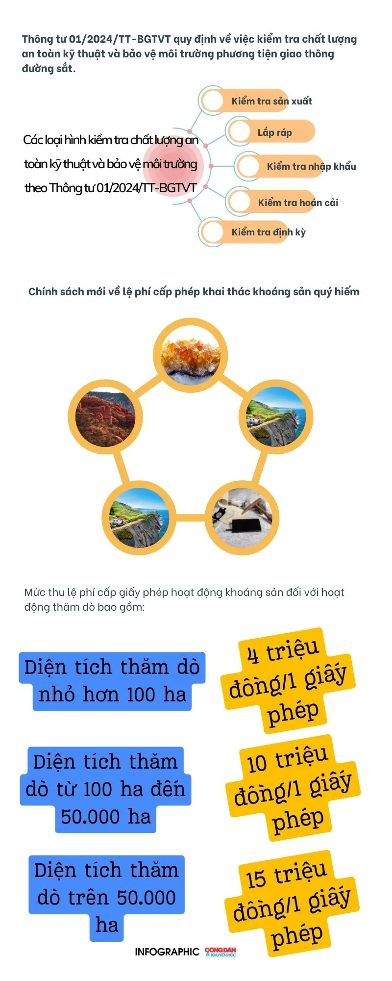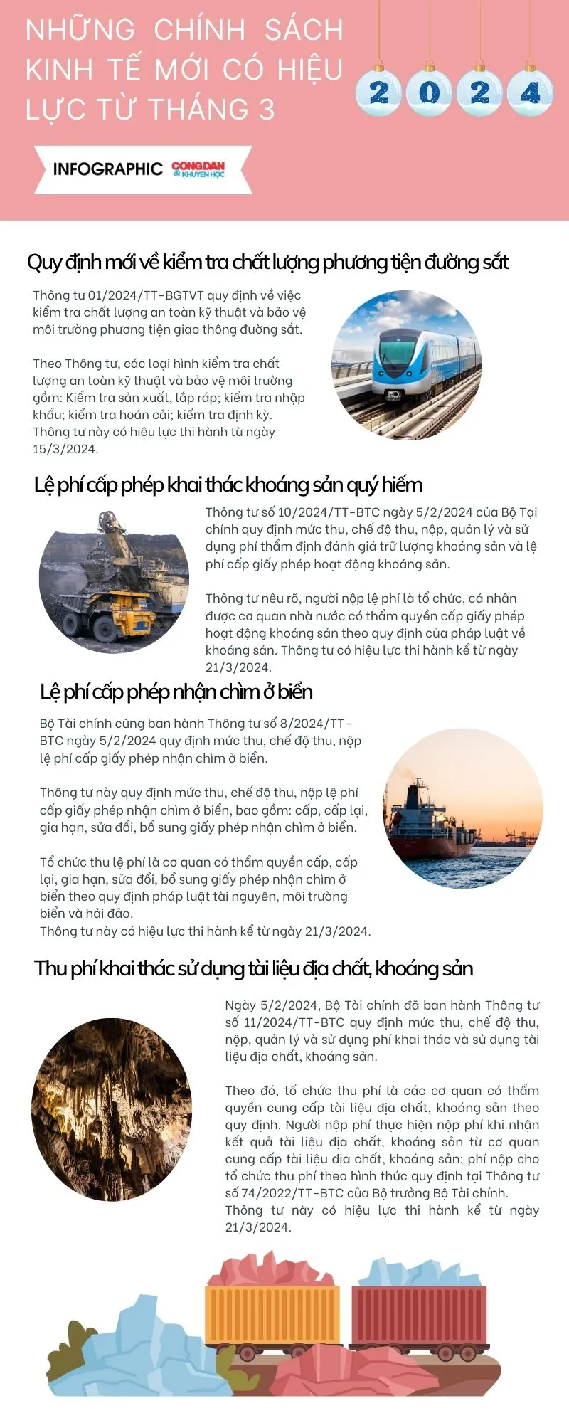 Các chính sách kinh tế mới sẽ có hiệu lực như: Quy định kiểm tra chất lượng phương tiện đường sắt; lệ phí cấp phép khai thác khoáng sản quý hiếm; lệ phí cấp phép nhận chìm ở biển; quy định thu phí khai thác sử dụng tài liệu địa chất, khoáng sản...