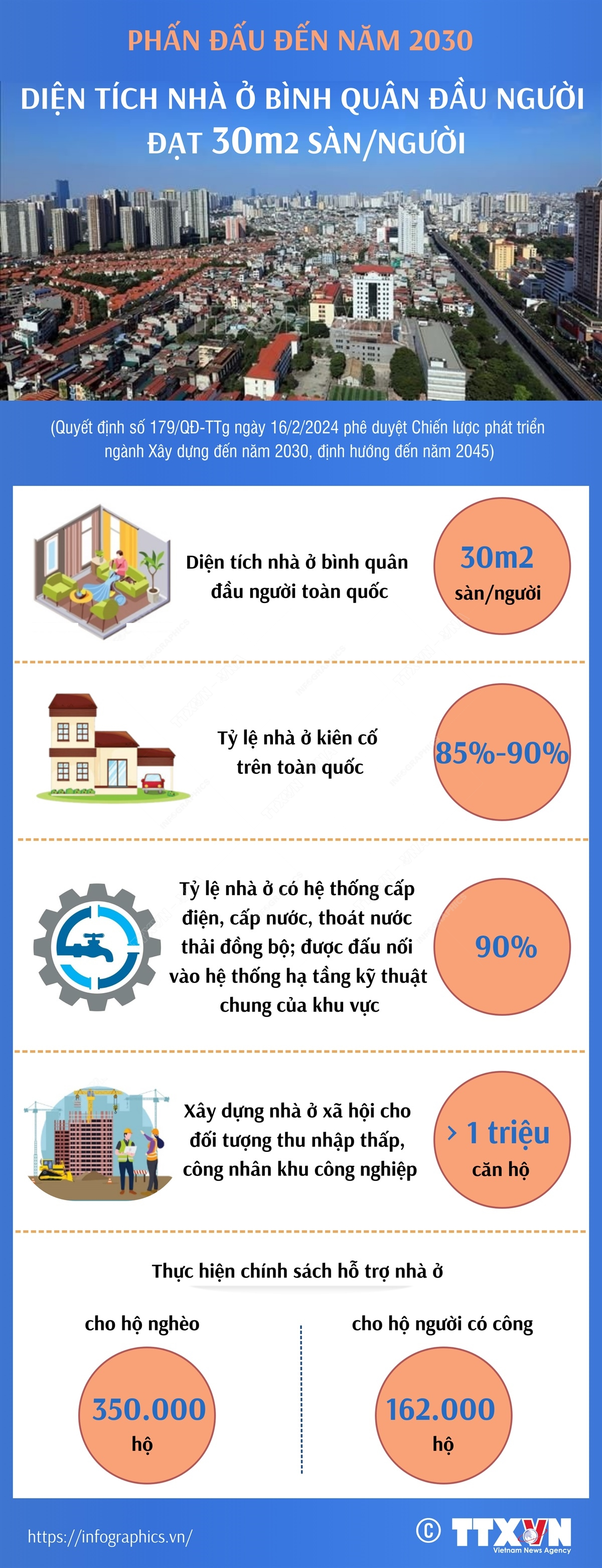 Ngành xây dựng đặt mục tiêu, đến năm 2030 diện tích nhà ở bình quân đầu người toàn quốc đạt khoảng 30m2 sàn/người; tỷ lệ nhà ở kiên cố trên toàn quốc đạt 85%-90%; xây dựng ít nhất 1 triệu căn hộ nhà ở xã hội cho đối tượng thu nhập thấp; hỗ trợ nhà ở cho khoảng 350.000 hộ nghèo, 162.000 hộ người có công…