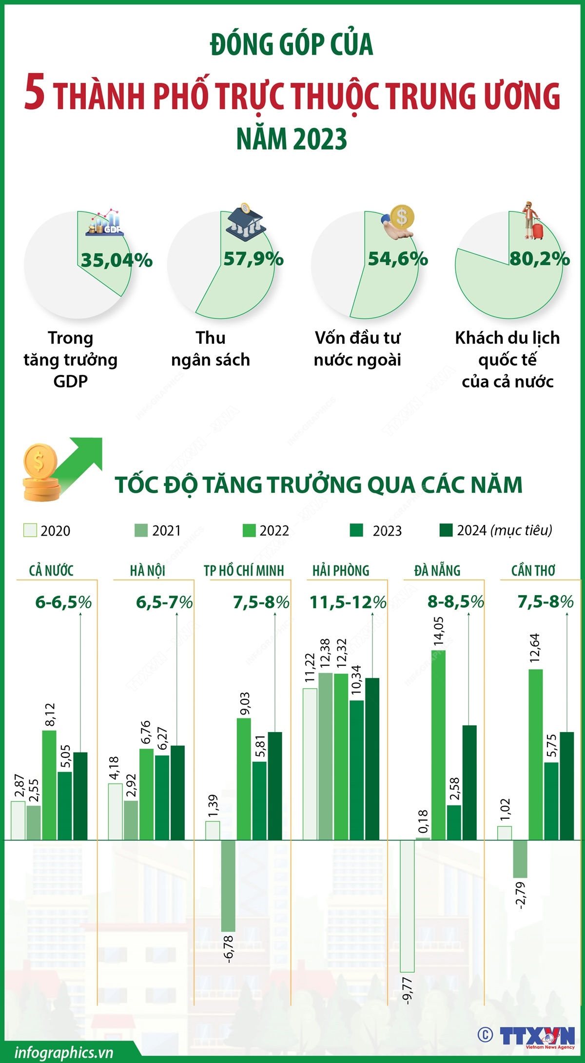 Năm 2023, 5 thành phố trực thuộc trung ương đóng góp 35,04% trong tăng trưởng GDP, 57,9% thu ngân sách, đạt 54,6% thu hút vốn đầu tư trực tiếp nước ngoài và 80,2% khách du lịch quốc tế của cả nước.