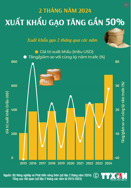 Theo số liệu của Bộ Nông nghiệp và Phát triển nông thôn, 2 tháng đầu năm 2024, xuất khẩu gạo đạt 708 triệu USD, tăng 49,8%. Các chuyên gia cho biết triển vọng xuất khẩu gạo năm 2024 tiếp tục khả quan khi các thị trường lớn cho thấy nhiều tín hiệu tăng nhập khẩu.