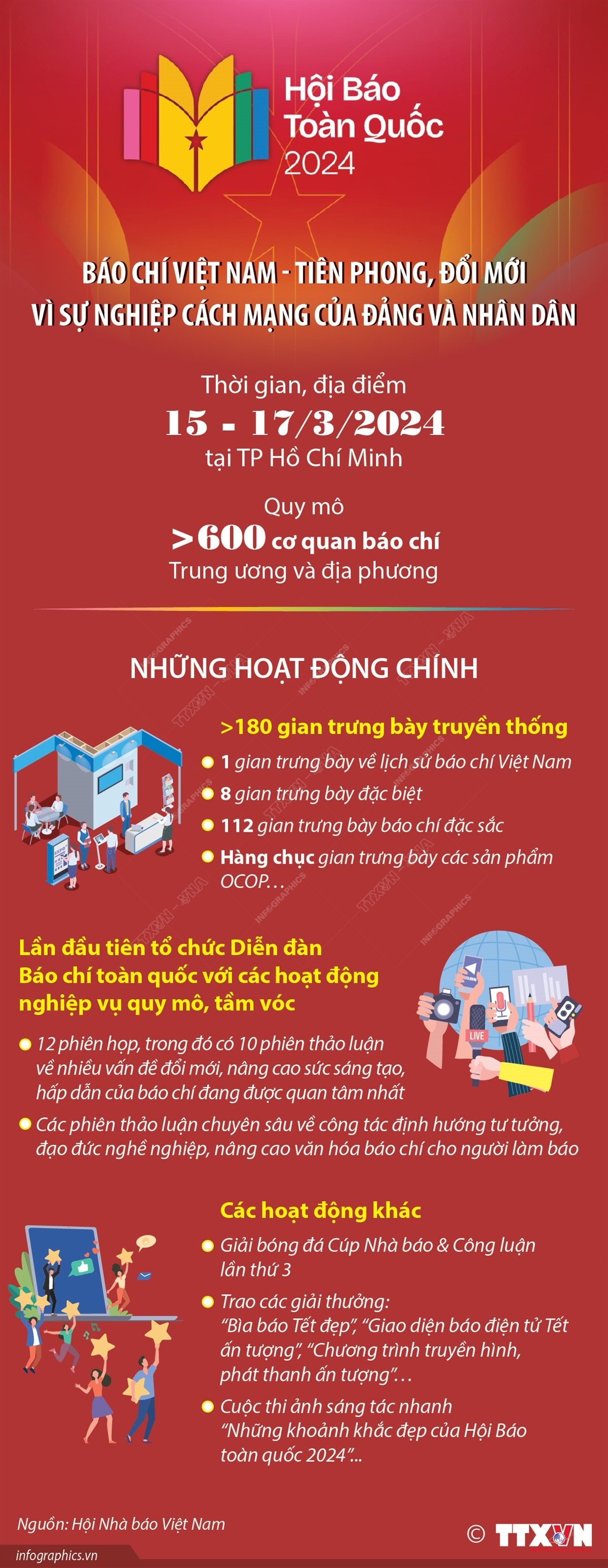 Hội Báo toàn quốc năm 2024 diễn ra từ ngày 15 - 17/3/2024 tại Thành phố Hồ Chí Minh. Đây là ngày hội lớn của những người làm báo trong cả nước. Đây cũng là lần đầu tiên, sự kiện do Hội Nhà báo Việt Nam chủ trì, phối hợp Ủy ban nhân dân Thành phố Hồ Chí Minh tổ chức được diễn ra tại thành phố mang tên Bác, với quy mô lớn nhất từ trước tới nay, mang đậm tinh thần “Báo chí Việt Nam - Tiên phong, đổi mới vì sự nghiệp cách mạng của Đảng và nhân dân”.