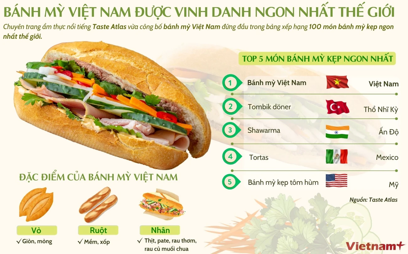 Chuyên trang ẩm thực nổi tiếng Taste Atlas công bố bánh mỳ đứng đầu trong bảng xếp hạng 100 món bánh mỳ kẹp ngon nhất thế giới với đánh giá 4,6/5 sao.