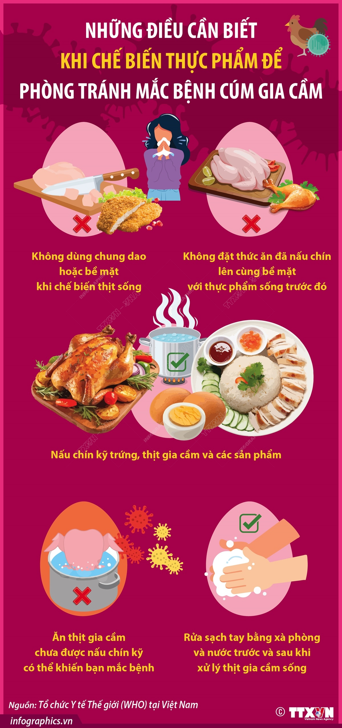 Để phòng tránh mắc bệnh cúm gia cầm, khi chế biến thực phẩm, người dân cần chú ý: không dùng chung dao hoặc bề mặt khi chế biến thịt sống, không đặt thức ăn đã nấu chín lên cùng bề mặt với thực phẩm sống trước đó, rửa sạch tay bằng xà phòng và nước trước và sau khi xử lý thịt gia cầm sống...