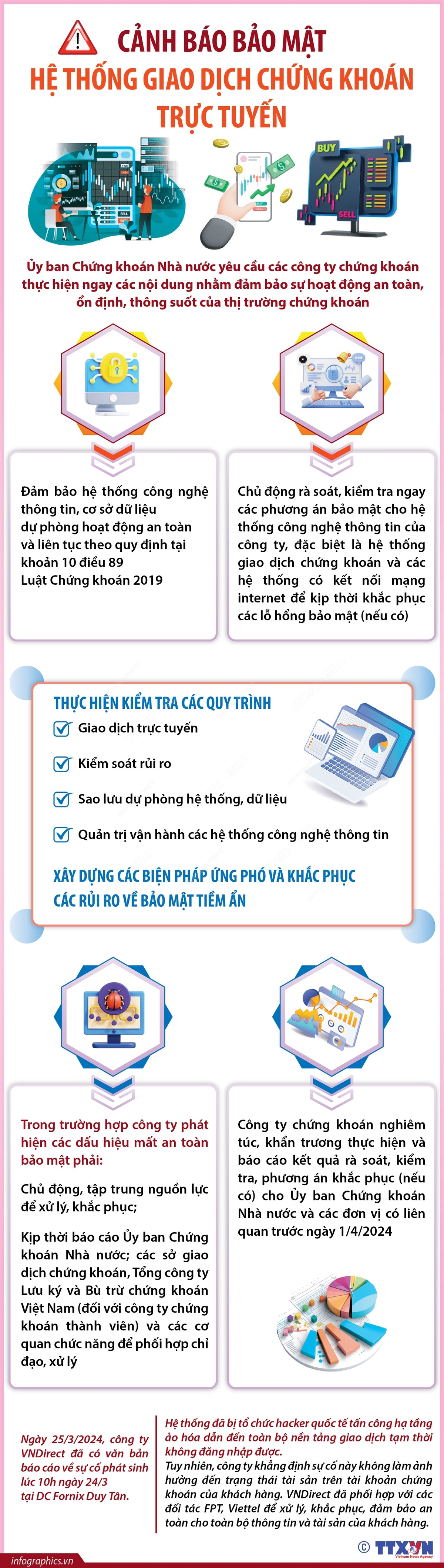 Trước sự việc trên thị trường đã xuất hiện trường hợp công ty chứng khoán bị tấn công vào hệ thống công nghệ thông tin dẫn đến hệ thống giao dịch chứng khoán của công ty đó tạm thời dừng hoạt động, ngày 25/3/2024, Ủy ban Chứng khoán Nhà nước đã có công văn số cảnh báo bảo mật hệ thống giao dịch chứng khoán trực tuyến. Theo đó, Ủy ban Chứng khoán Nhà nước yêu cầu các công ty chứng khoán thực hiện ngay các nội dung nhằm đảm bảo sự hoạt động an toàn, ổn định, thông suốt của thị trường chứng khoán.