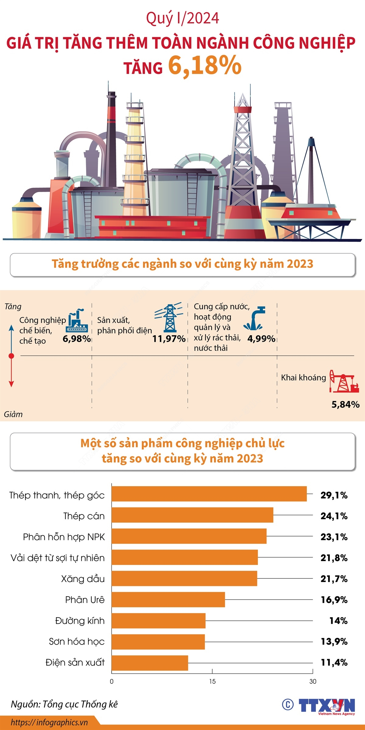 Sản xuất công nghiệp trong quý I/2024 tiếp tục khởi sắc với giá trị tăng thêm toàn ngành ước tính tăng 6,18% so với cùng kỳ năm 2023, trong đó công nghiệp chế biến, chế tạo tăng 6,98%.Quý I/2024: Giá trị tăng thêm toàn ngành công nghiệp tăng 6,18%