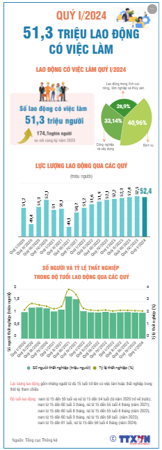 Quý I năm 2024, số người từ 15 tuổi trở lên có việc làm đạt 51,3 triệu người, tăng 174,1 nghìn người (tương ứng tăng 0,34%) so với cùng kỳ năm trước. Tỷ lệ thất nghiệp trong độ tuổi lao động giảm 2,24% so với cùng kỳ năm trước.
