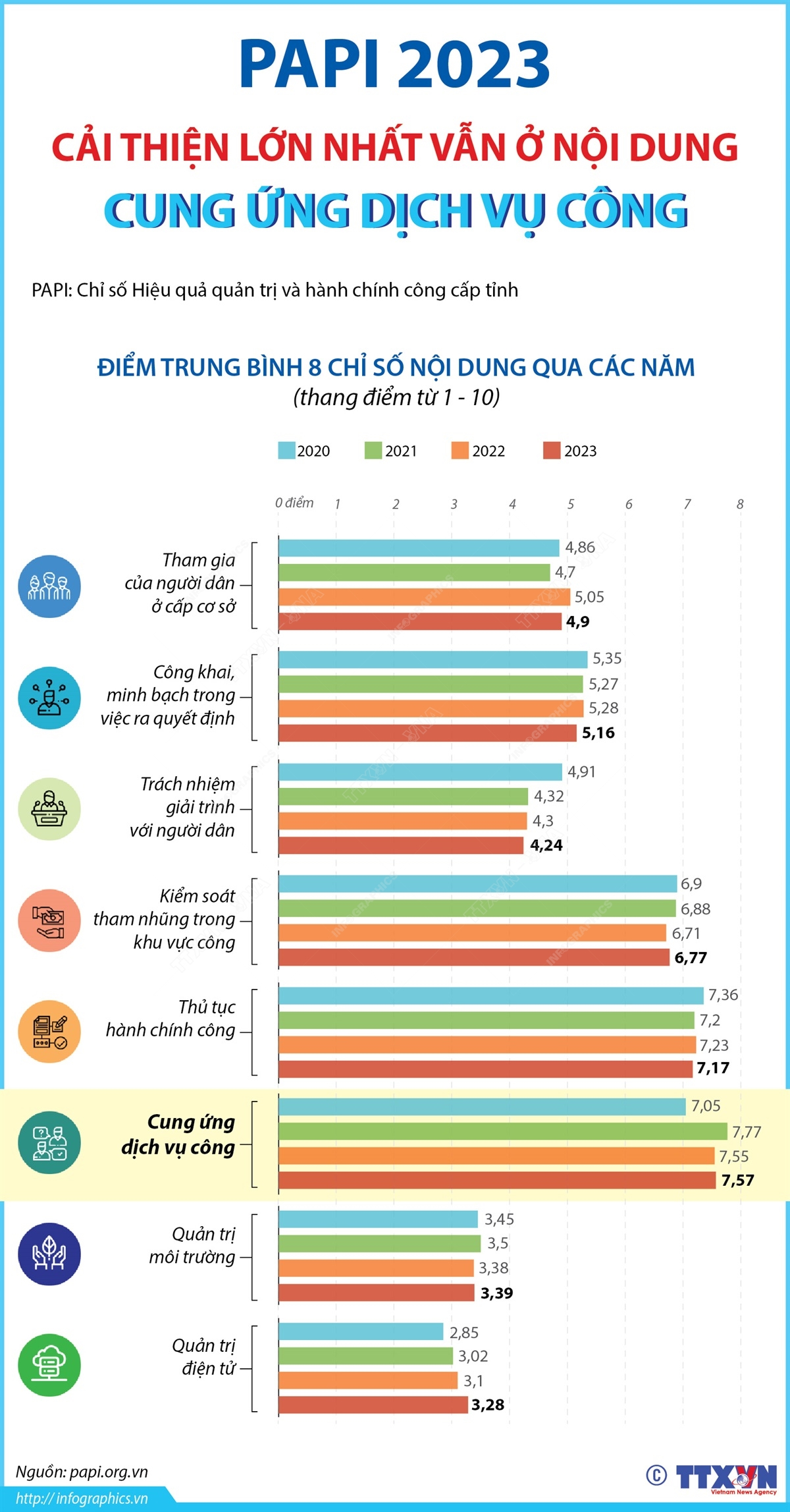 Kết quả phân tích dữ liệu Chỉ số Hiệu quả quản trị và hành chính công cấp tỉnh (PAPI) 2023 có những chuyển biến tích cực, đặc biệt ở nội dung Cung ứng dịch vụ công. Chỉ số nội dung “Cung ứng dịch vụ công” đo lường mức độ hiệu quả cung ứng bốn dịch vụ công căn bản cho người dân, gồm: Y tế công lập, Giáo dục tiểu học công lập, Cơ sở hạ tầng căn bản và An ninh, trật tự tại địa bàn khu dân cư. Thông qua khảo sát PAPI, người dân đánh giá mức độ thuận tiện khi sử dụng dịch vụ công, chất lượng và mức độ sẵn có của các dịch vụ công căn bản từ cấp xã/phường, quận/huyện đến tỉnh/thành phố dựa trên trải nghiệm thực tế của bản thân và gia đình họ.