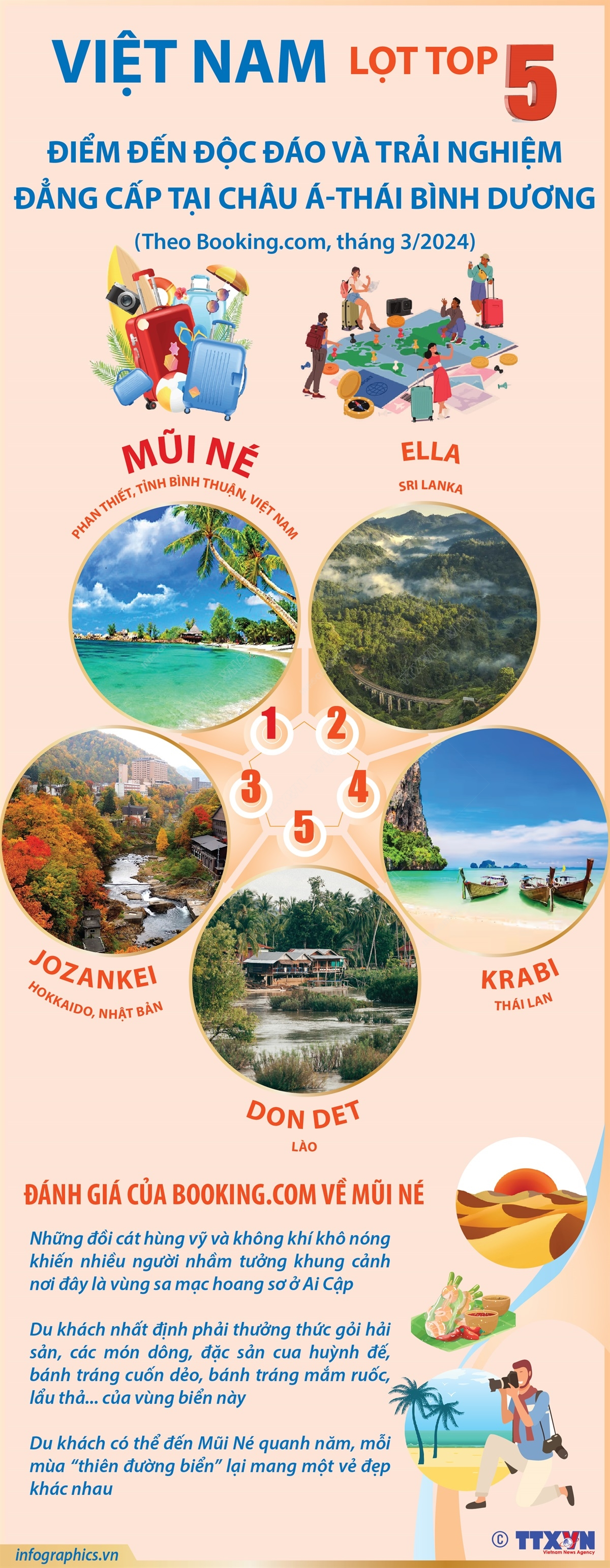 Trang Booking.com cuối tháng 3/2024 công bố danh sách các điểm đến độc đáo, gây bất ngờ, mang đến những trải nghiệm đẳng cấp thế giới ngay trong khu vực châu Á-Thái Bình Dương. Mũi Né (Phan Thiết, tỉnh Bình Thuận) của Việt Nam lọt vào Top 5 của danh sách này.