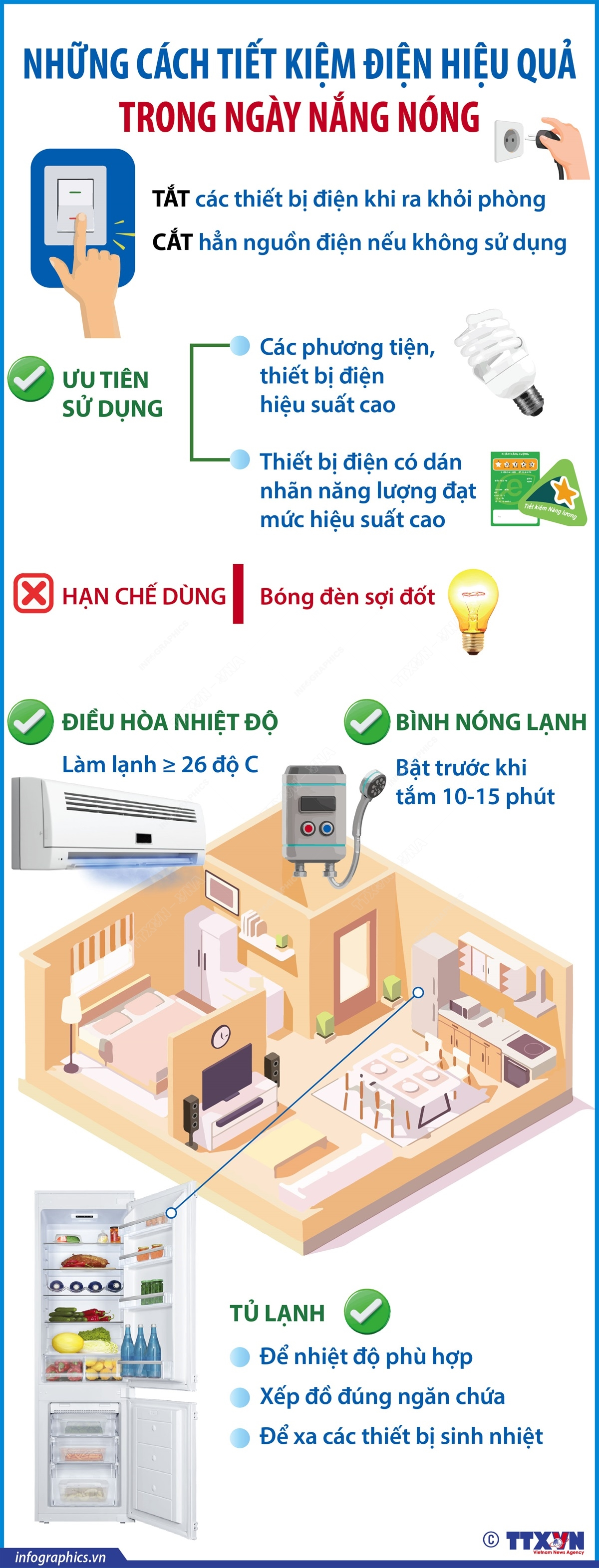 Bước vào cao điểm nắng nóng, nhu cầu sử dụng điện tăng mạnh. Để kiểm soát và tiết kiệm điện, người dân cần sử dụng các thiết bị có dán nhãn tiết kiệm năng lượng, thường xuyên vệ sinh bảo dưỡng thiết bị, rút phích cắm khi không sử dụng…, nhờ đó giảm chi phí tiền điện hằng tháng và cũng góp phần bảo vệ môi trường.