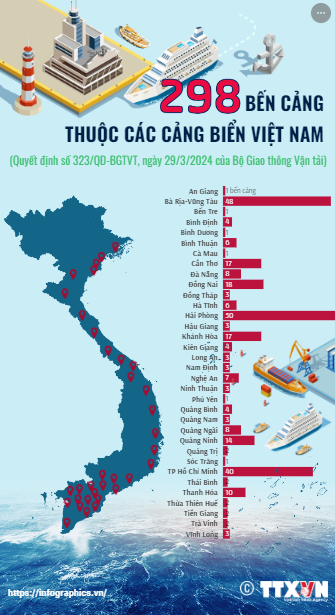 Theo Quyết định số 323/QĐ-BGTVT, ngày 29/3/2024 của Bộ Giao thông Vận tải, cả nước có 298 bến cảng thuộc các cảng biển Việt Nam. Trong đó, Hải Phòng là địa phương có số lượng bến cảng nhiều nhất cả nước (50 bến cảng), Bà Rịa-Vũng Tàu đứng thứ 2 với 48 bến cảng, TP Hồ Chí Minh đứng thứ ba với 40 bến cảng.