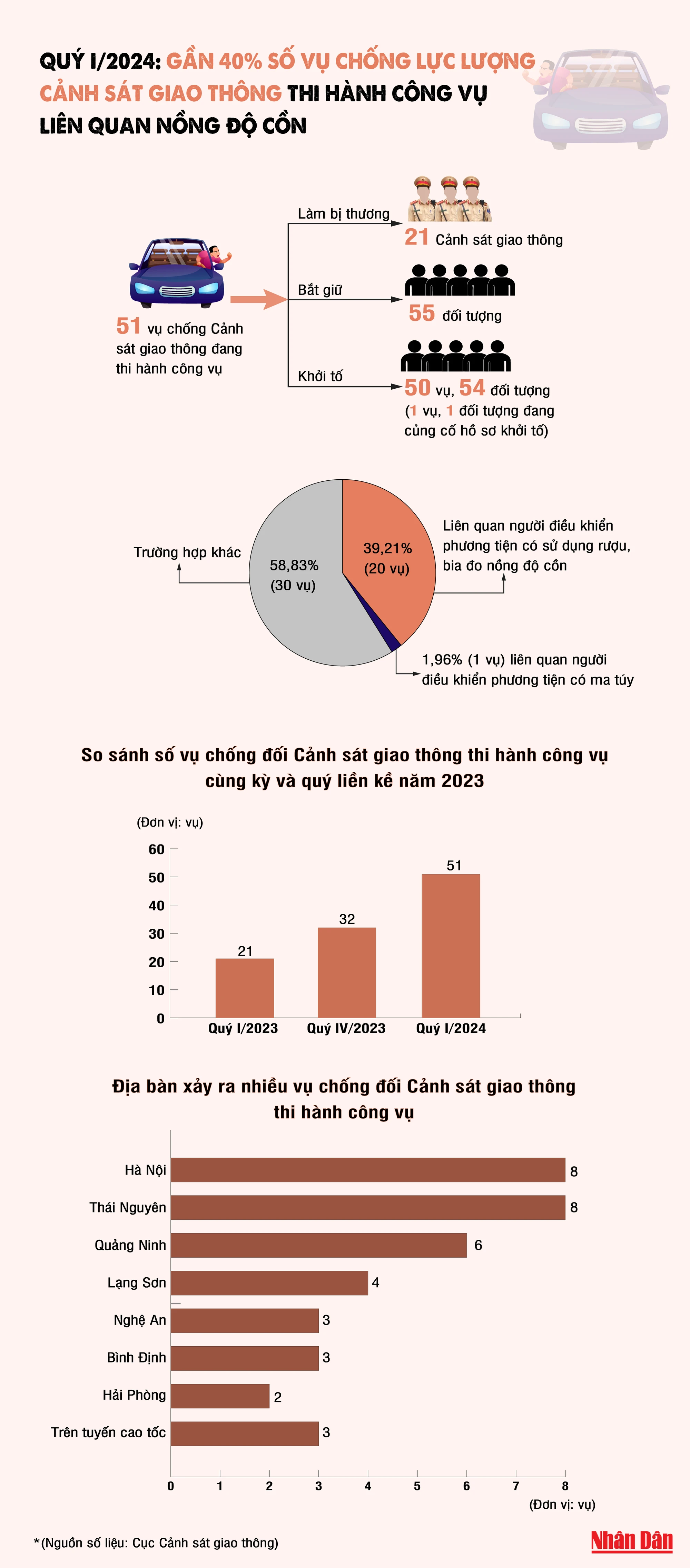 Theo Cục Cảnh sát giao thông, quý I/2024, toàn quốc xảy ra 51 vụ chống đối lực lượng cảnh sát giao thông đang thi hành công vụ, trong số đó có 20 vụ liên quan người điều khiển phương tiện có sử dụng rượu, bia, chiếm 39,21%.